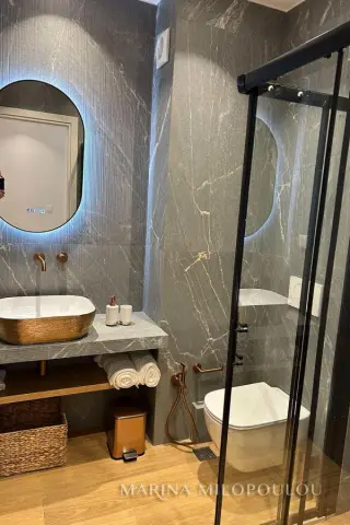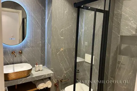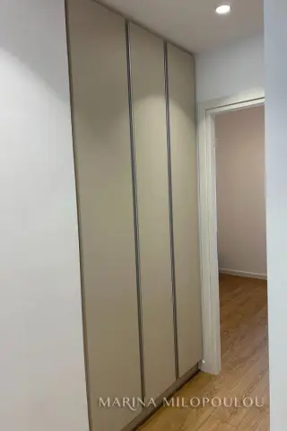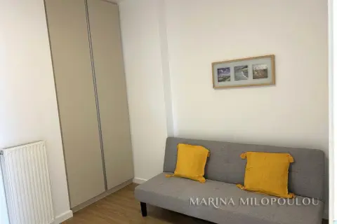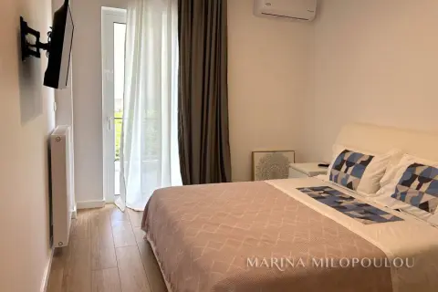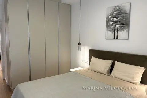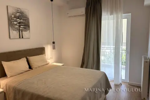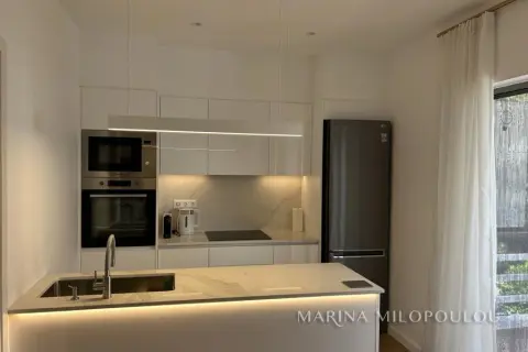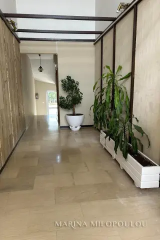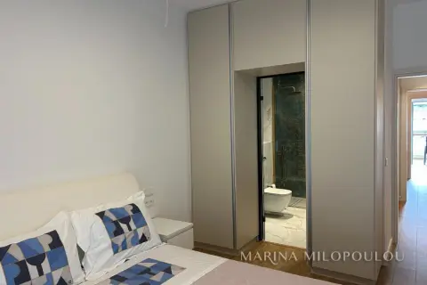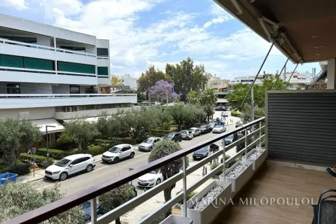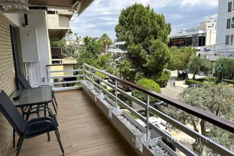 GLYFADA-Center, 1st floor apartment, 120sqm, renovated and furnished, northeast orientation. Consists of a single reception-dining room, open kitchen fully equipped, 2 bedrooms (1 master), 1 study room ( without window) and 1 additional bathroom. It has a security door, autonomous natural gas heating, fireplace, 3 a/c, double energy-efficient windows, mosquito nets, hot water all day (from natural gas), electric awnings, alarm, laminate flooring, Basement parking space included (in a garage outside the building 30m away), verandas, elevator. No pets. Maintenance expenses 60€ It is part of a 3-storey building, within the shopping area of Glyfada, 500m from the beach, 1.5km from an organized beach in the area, 8km from the marina of Asteras. Available from 01/01/2026.