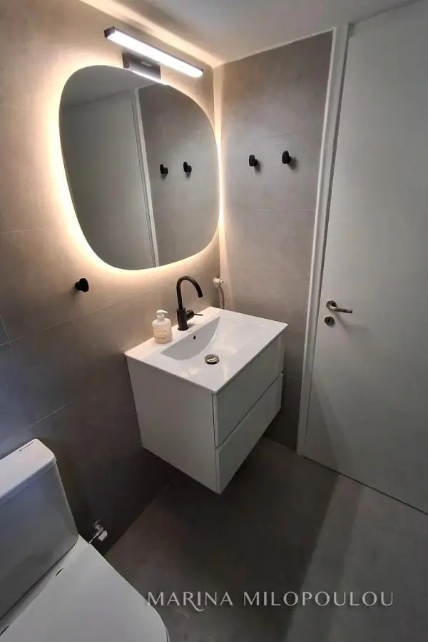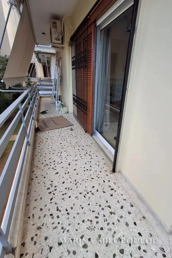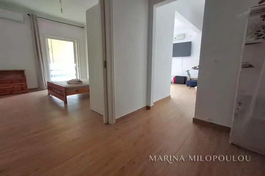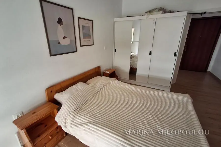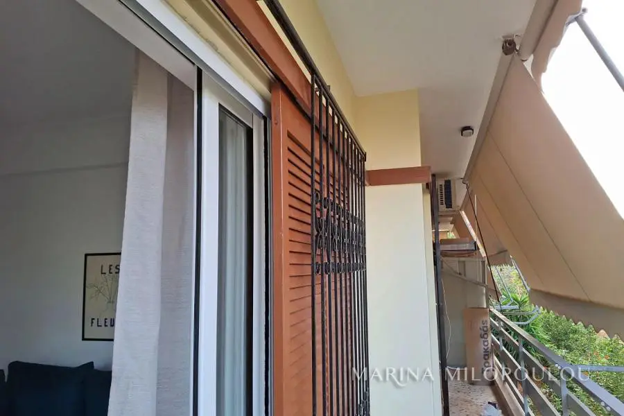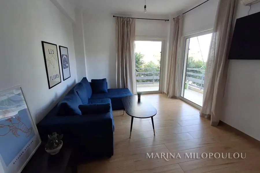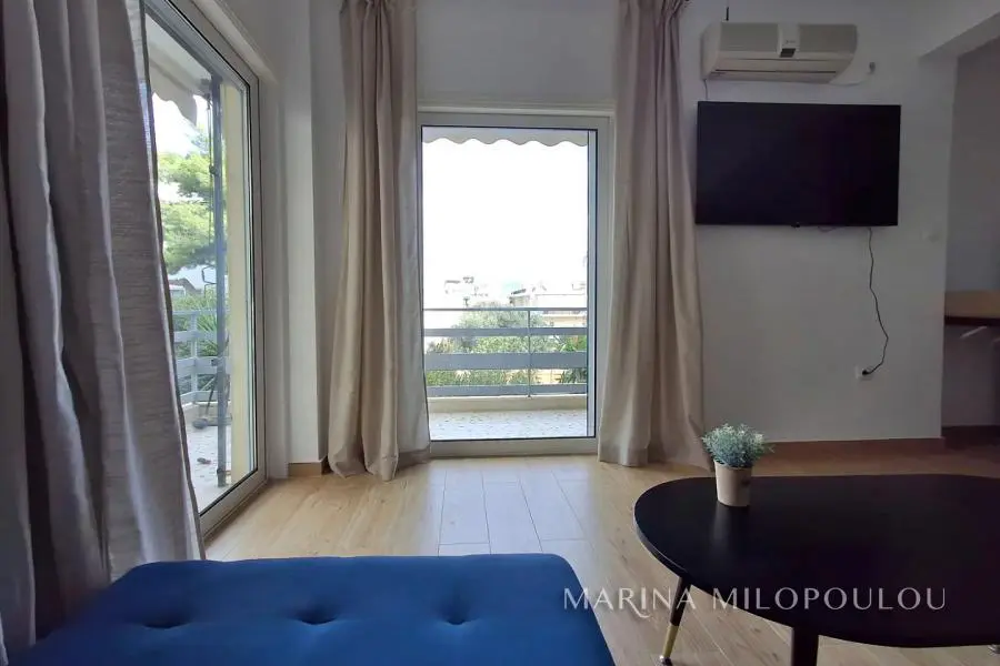 VARKIZA - in a very quiet "green" area, a bright apartment 52sqm on the 1st floor, 630 meters from the sea. It has been renovated in the summer of 2025 and is available furnished or empty. Reception area, open kitchen, 1 comfortable bedroom, 1 bathroom, verandas on 3 sides with views of the gardens. It features a security door with a non-copyable key, aluminum frames with screens and security gates, new awnings, 2 A/Cs for cooling and heating, storage loft above the bathroom, tiled floors, electric water heater. Maintenace approx. 15€/month. It is part of a 3-story building with an elevator, a large piloti, garden and many parking spaces in the public area in front of the building. Distance 700 meters from the center of Varkiza with stores cafes - restaurants, 850 m from the organized sandy beach "Varkiza Resort", 2.2 km from Vouliagmeni and 20 km from the intern airport.