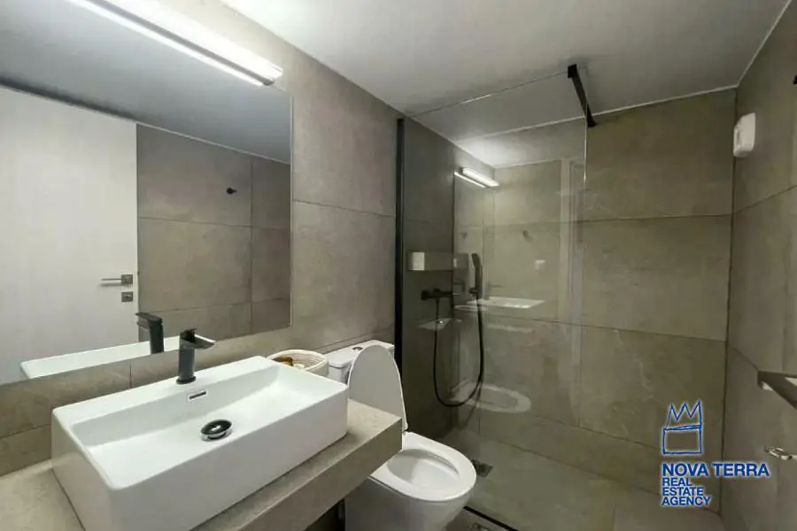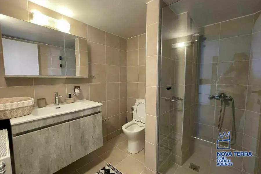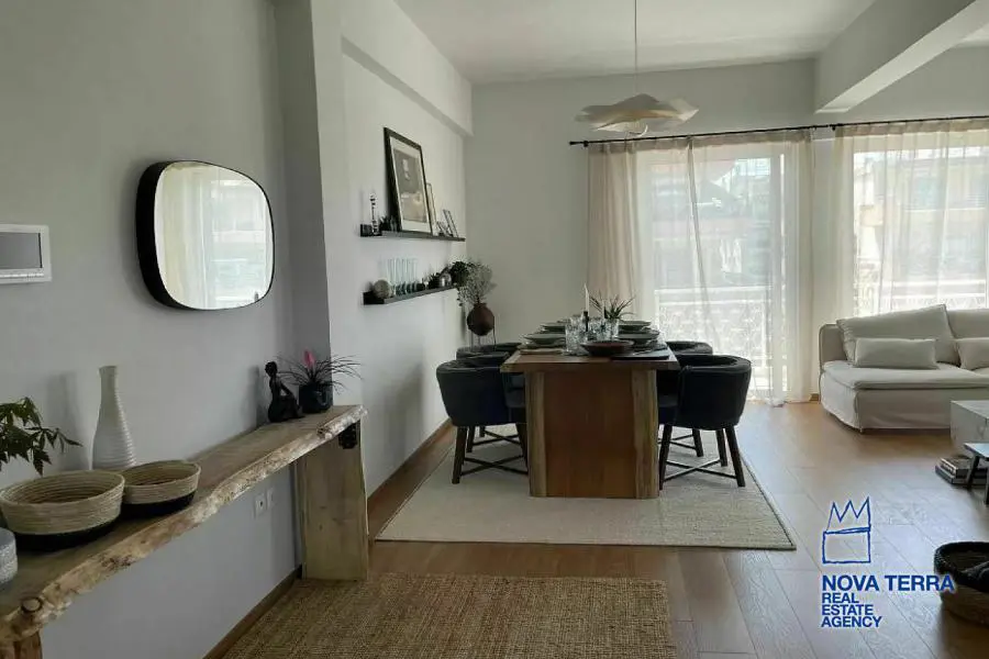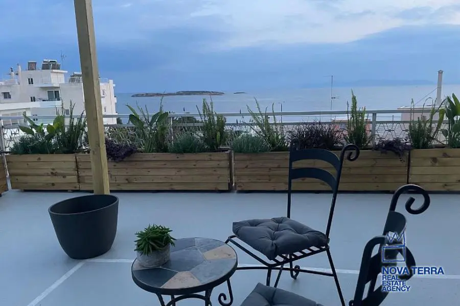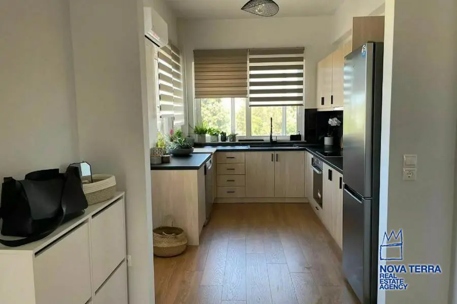 Luxury apartment for rent in Voula Kato with stunning sea views. This 97 sq.m apartment renovated in 2022. It features 2 bedrooms, a balcony, 2 bathrooms, a fireplace, and is fully furnished. The kitchen and living room are spacious and the flooring is laminate. There is a privet terrace with a studio. Heating is provided by air conditioning. The apartment is located in a residential. It is in perfect condition and includes a parking area. Energy class: Β. Property ID: 48075. For more information, visit www.nova-terra.gr.