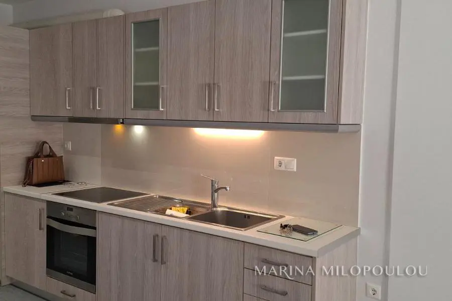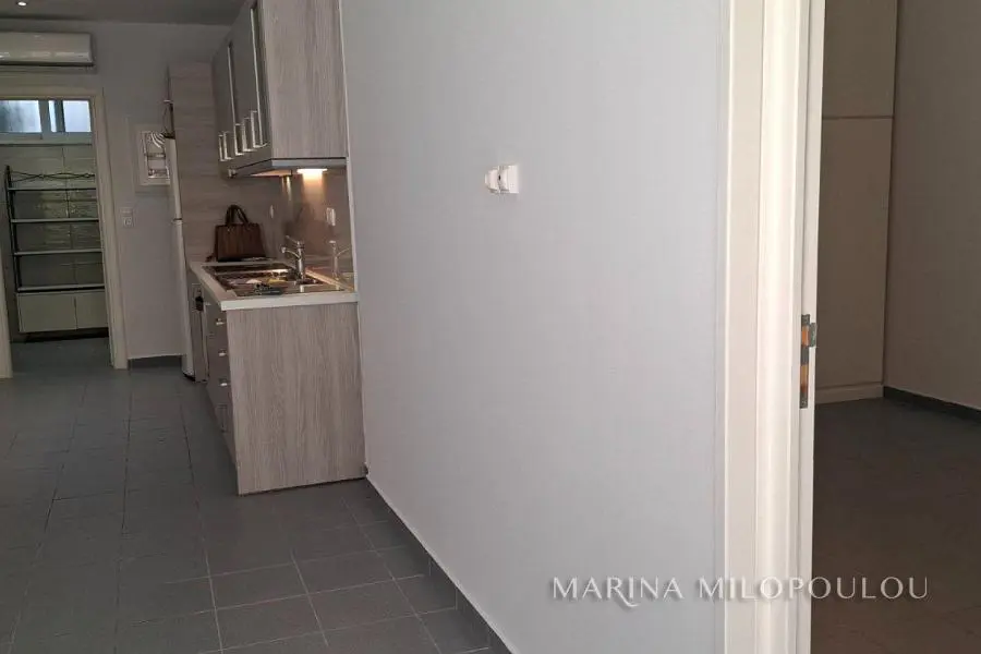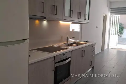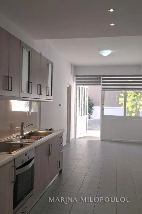 VOULA – Dikigorika, a fully renovated 58 sq.m. ground-floor apartment in a quiet residential neighborhood. Open-plan living area with kitchen (built-in cooktop, oven & hood), 1 large bedroom with ample wardrobes, 1 spacious bathroom, and access to a private yard connected to the parking area. Features include double-glazed windows, 2 A/C units, concealed lighting, electric shutters, granite flooring, and 2 open parking spaces. Part of a well-maintained semi-detached building, located in a peaceful area close to a local bus stop. No common expenses. Distances: 1 km from Voula center, 1.5 km from the beach, 1.8 km from B’ Beach (ABC Beach Club redevelopment).