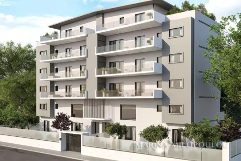 GLYFADA - Evryali, a newly bulit, corner building Maisonette (Loft type), 186 sq m Ground floor - 1st, with private garden and swimming pool. - Ground floor, the reception - dining area (double height with natural gas fireplace), open kitchen, 2 master bedrooms and 1 wc. Direct access to the garden 320 sq m with the swimming pool (10 sq m) - Loft, 2 master bedrooms with walk-in closets - one with veranda (access only by internal staircase). It is part of a 5-storey corner building with a total of 8 properties, energy class (A++) which has photovoltaic panels. It features a heat pump, fan coil, underfloor heating, triple energy solar panels for hot water supply, high-end thermal facade and heavy-duty thermal break frames with triple glazing, "Smart Home" technology, fire safety system, security alarm and cameras. This apartment also comes with 2 basement parking spaces and a storage room. The materials of the interior construction are configured according to the buyer's taste. Zone price 2250€. It is located on a main road, 80 meters from Vouliagmenis Avenue and a local market, 800 meters from the Elliniko metro station, 1.3 km from the current entrance to the Metropolitan Park, 2.5 km from Glyfada beach, 3 km from the shopping area of Glyfada and 24 km from the intern. airport.
