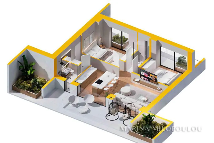GLYFADA Ano (below Gounari Ave) in a building under construction, a 1st floor apartment, 70 sqm, with East-West orientation. Single reception - dining area - kitchen, 2 bedrooms (with verandas), 2 bathrooms, an additional veranda in the living room. It is part of a modern 5-storey corner building with a total of 12 properties. It features air conditioning, underfloor heating, thermal break energy windows, hybrid solar panels for hot water, basement parking space and storage. Zone price €2350. It is located very close to a local market, 2.2 km from the Elliniko metro station and the shopping area of Glyfada, 3 km from the beach of Glyfada, 3.5 km from the Ellinikon Metropolitan Park and 26 km from the Intern airport Estimated delivery 12/2026.