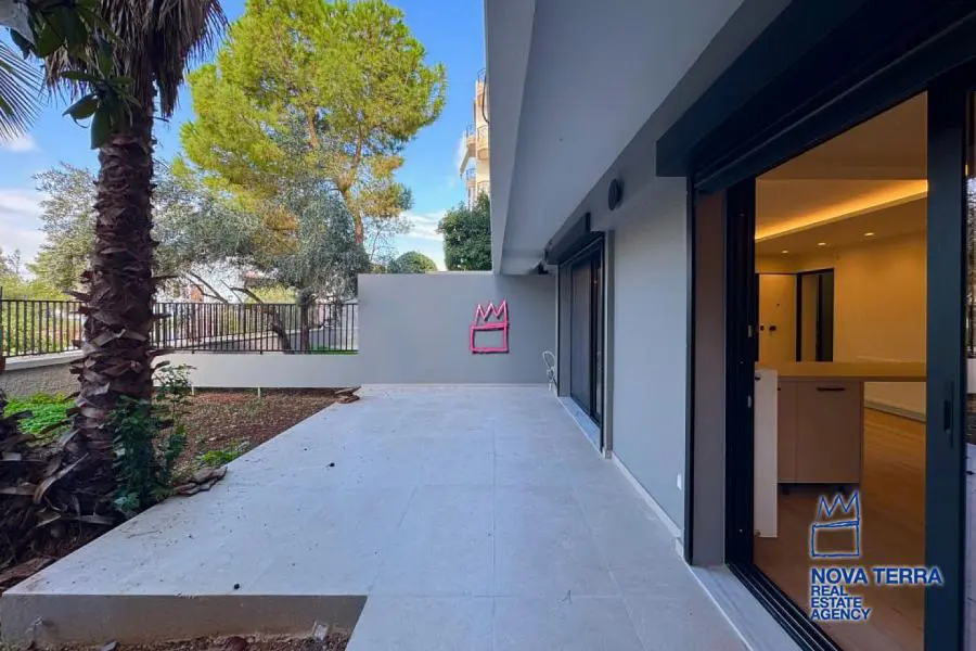 GLYFADA - EXONI, Apartment,, Sale, 62 sq.m, year built 2023, 2 rooms, Ground Floor, Various Characteristics: Balcony, Bath, Garden, Kitchen, Living room, Refurbished, Flooring: Wooden floor, Heating: Air Conditioning, Floor heating, Heating pump, Access road, Aluminium panels, Bright, Double-glazing, Electric Roller Windows, Facade, From Side to Side, Luxury, Minimal, Painted, pets allowed, Residential area, Screens, Security Door, Solar Heating, Weekend Residence, In perfect condition: Pets allowed: Satellite dish: For investment: Parking area: Parking, Energy class: A. property ID: 49091, www.nova-terra.gr