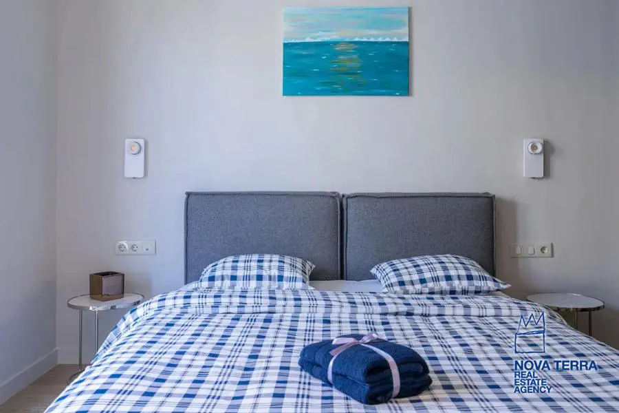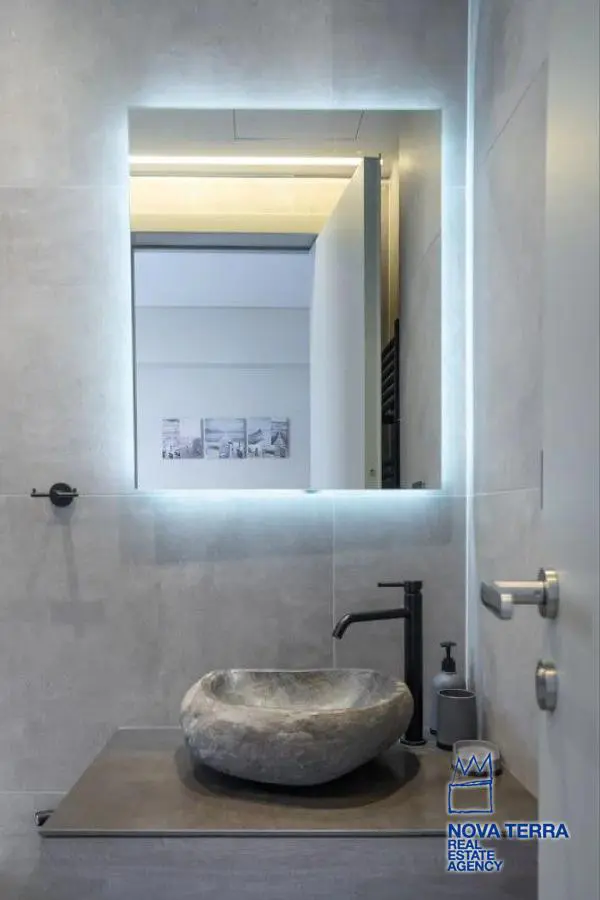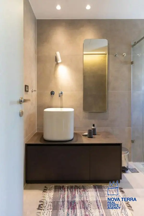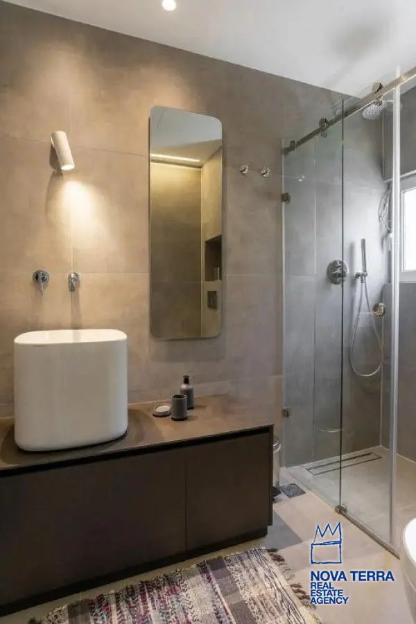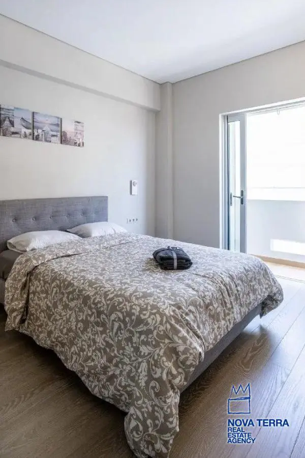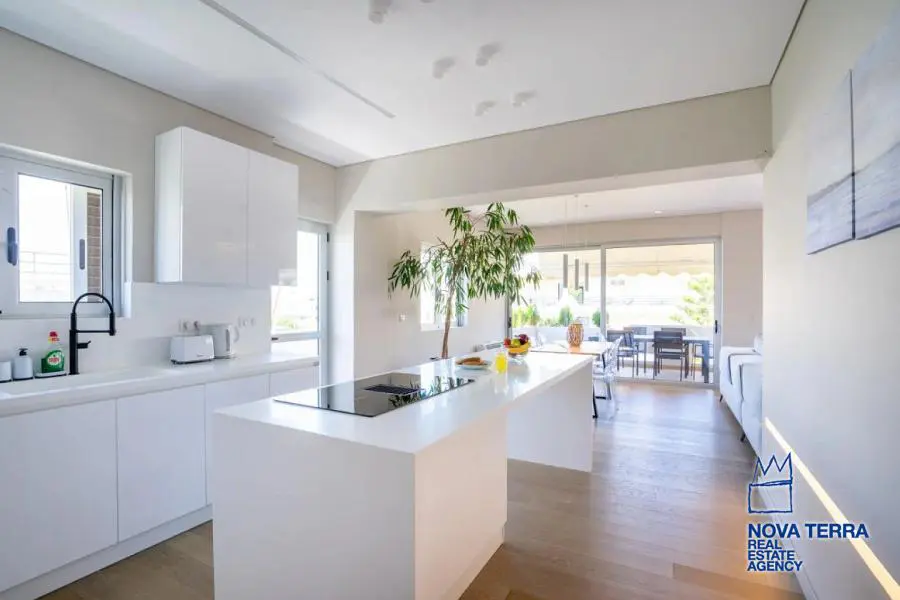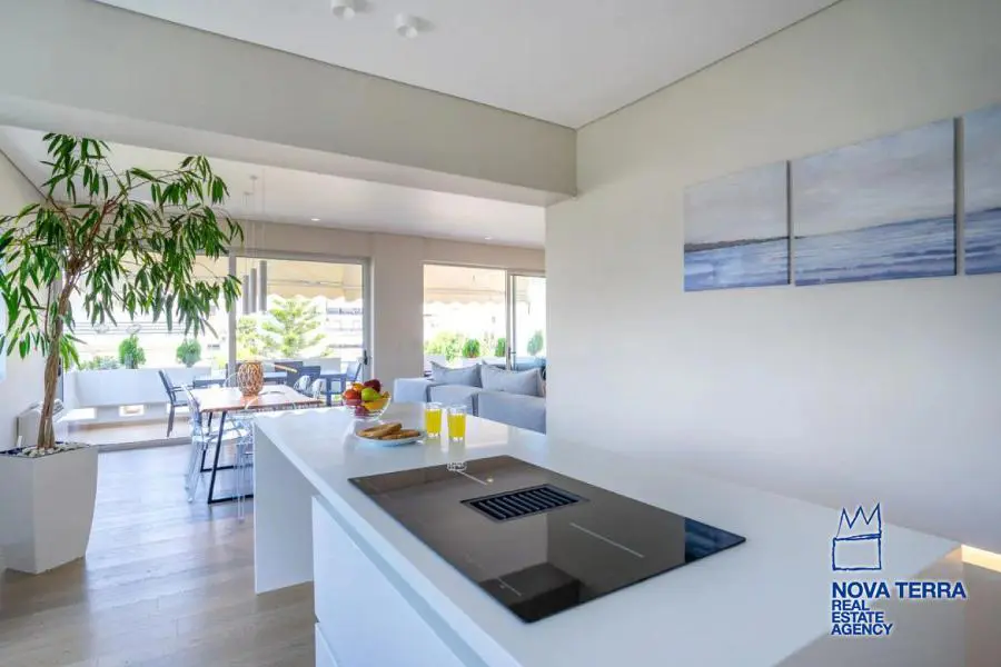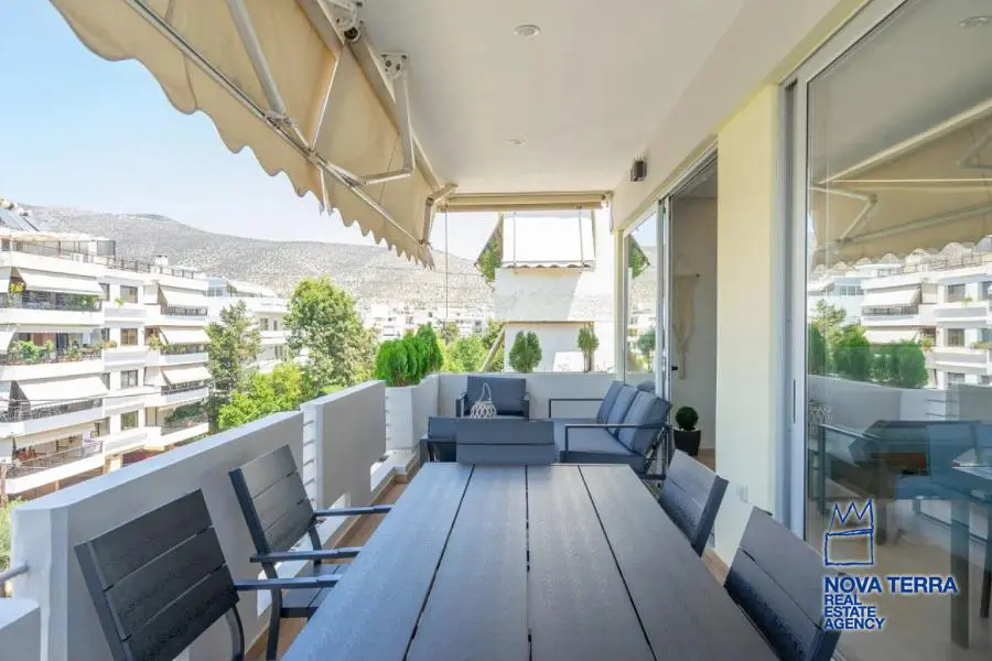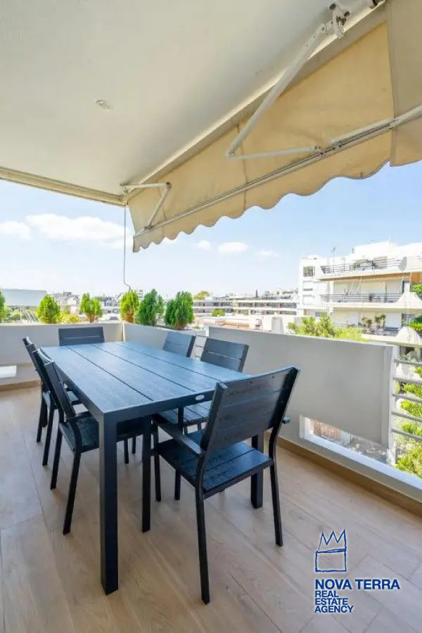 Luxurious apartment on the 4th floor in kato glyfada, fully refurbished and furnished. Open view. Open kitchen (white) with the latest equipment 2 master bedrooms with bathrooms Central AC big balcony with outdoor furniture and tents Elevator Well maintained building Close to shops and restaurants