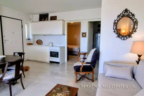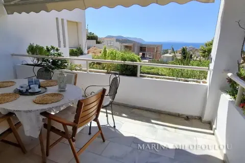 ANAVYSSOS - Agios Nikolaos, elevated 1st floor apartment, 58 sq m with panoramic sea view. Reception area, open kitchen, 1 master bedroom (with possibility of 2nd), 1 bathroom, 1 wc, large terrace. It features autonomous oil heating, security door, double glazing, screens, awnings, additional safety railings, marble floors, secyrity alarm, closed parking space, 6 sq m storage room. It is part of a complex of 16 residences, within an plot of 1420 sqm. Monthly maintenance expenses 30 € aprox. Zone price 1850 €. It is located on a hill with panoramic views of the sea, in a very quiet country environment, in a beautiful area of the Athenian Riviera with rising demand and residential development. Distance 750 m from the beautiful sandy and organized beach of Agios Nikolaos, 3.8 km from Palaia Fokaia, 4.8 km from Saronida, 17 km from the new large passenger port of Lavrio, 31 km from the International Airport.