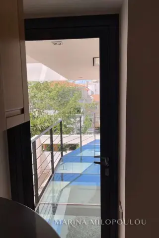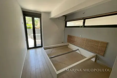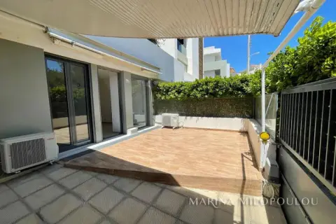 VOULA-Kalymniotika, Ground floor apartment, northeast orientation. It consists of a single reception-dining area with fireplace, kitchen with electrical appliances, 2 bedrooms, 1 bathroom and 1 wc. It features a security door, a heat pump, 2 A/Cs, double glazing, solar water heater, electric roller shutters, electric awnings, security alarm, 7sqm storage room, 2 parking spaces, one basement and one open. Maintenance expenses 25€. Zone price 2400€ Located infront of a green hill. in a very quiet, residential area with elegant houses. 450 m from a Deli market, 1.5 km from Voula's center, and from "Apollon Hotel" organized beach in Kavouri and 19 km from the intern. airport.