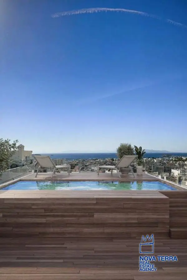 VOULA - DIKIGORIKA, Penthouse,, Sale, 152 sq.m, year built 2025, 3 rooms, 3rd, 4th, View: Seaview, Unobstracted view, Various Characteristics: Balcony, Bath, Escalator, Fire Place, Garden, Kitchen, Living room, Penthouse, Store Room, Swimming Pool, Master Bedrooms: 1 Master Bedroom, Flooring: Wooden floor, Heating: Floor heating, Access road, Aluminium panels, Bright, Double-glazing, Electric Roller Windows, Facade, From Side to Side, Luxury, Minimal, Newly built, Painted, Screens, Security Door, Solar Heating, Weekend Residence, In perfect condition: For investment: Parking area: Garage, Energy class: A. property ID: 52347, www.nova-terra.gr
