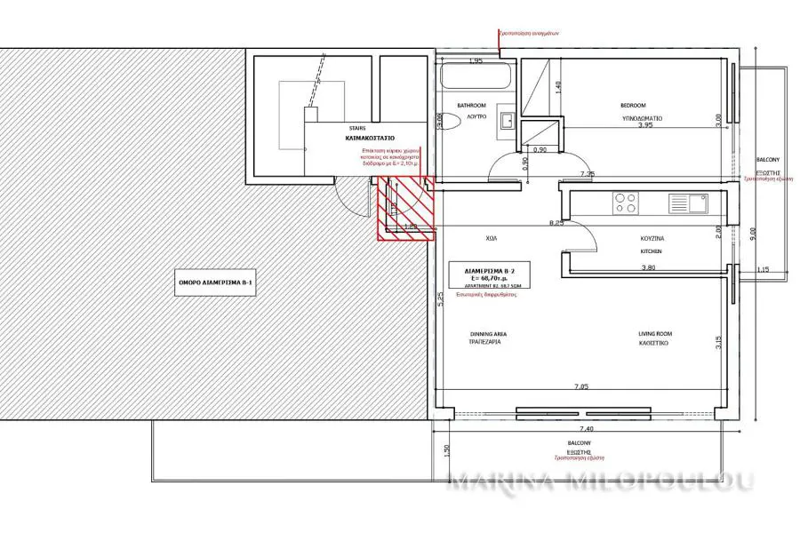 VOULA, border with Glyfada, a 2nd floor apartment, 68,70 sqm. It consists of a comfortable reception-dining area, separate kitchen, spacious bedroom, comfortable bathroom, 2 terraces. There is possibility for a second bedroom/study. It features heating with thermal accumulators, marble floors, wodden windows, common storage groundfloor (50 sqm). It is part of a corner, well-maintained 4-storey building, with total of 6 properties, within a plot of 807 sqm. Zone price €2800. Excellent property location, in a quiet residential neighborhood, very close to a local market (large S/M) and at a distance of 1.5 km from the center of Voula, 2 km from the organized beach of Voula, 2.2 km from the shopping area of Glyfada and 21 km from the intern. airport.