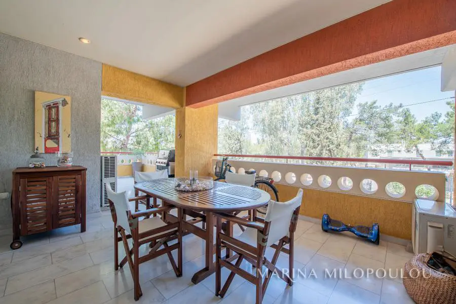 VOULA, 600m from the sea, a 1st floor apartment with ground floor studio, total area 180 sq m. Reception-dining area, separate kitchen with small living room, 2 bedrooms (1 master), 1 additional bathroom, 1 office space, large front veranda. It features a security door, double glazing, screens, autonomous oil heating, solar water heater, fireplace, 5 A/Cs, oak floors in the bedrooms and marble in the rest of the rooms, alarm, built-in electrical appliances, large verandas, 8sqm storage room, 2 outdoor parking spaces with open horizon, green view and north orientation. The ground floor studio of 40 sq m, consists of an open-plan living room with kitchenette, 1 bedroom and 1 bathroom. It is accessed via an internal staircase, but can also function independently as a guest house or office, thanks to its private entrance and direct access to a secluded part of the garden, where two covered parking spaces are located. The apartment is located on a light traffic street, within walking distance of the organized beach of Voula, 500m from a local market, 950m from a sandy public beach, 1.2 km from the center of Voula, 2.5 km from the shopping area of Glyfada, 6 km from the Hellinikon Metropolitan Park and 22km from Athens airport.