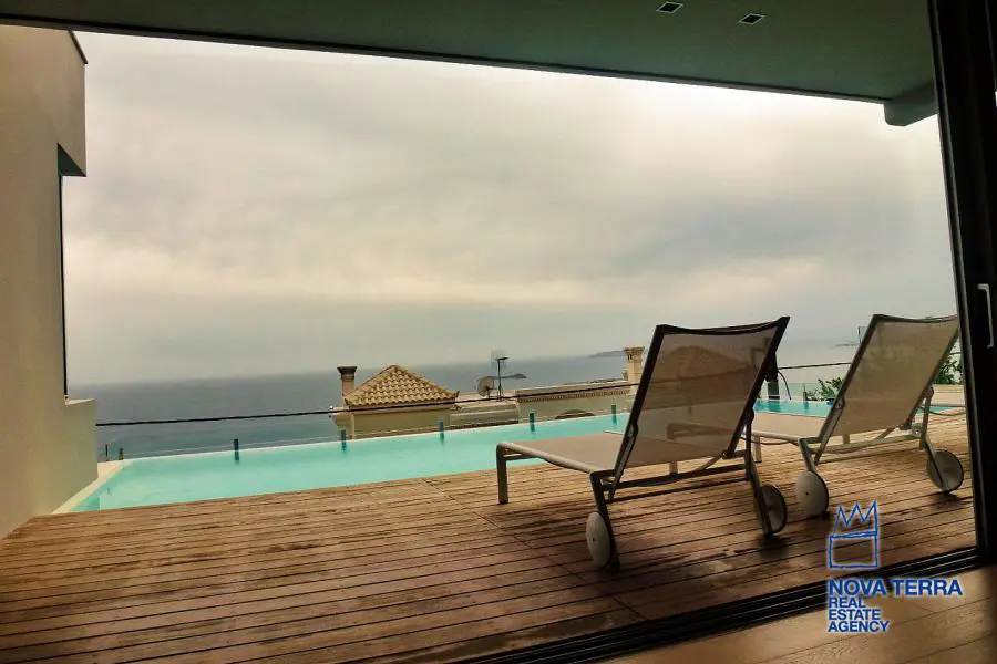 AGIA MARINA, House, 500 sq.m, on a plot of 700 sq.m, year built 2004, 5 rooms, Ground Floor, 1st, 2nd, 3rd, View: Seaview, Unobstracted view, Unobstracted view, Various Characteristics: Balcony, Bath (4), Escalator, Fire Place (2), Furnished, Garden, Playroom, Store Room, Swimming Pool, Toilet, Master Bedrooms: 3 Master Bedrooms, Flooring: Wooden floor, Heating: Air Conditioning, Autonomous Heating, , Boiler, Computer Terminal Ready, Detached, From Side to Side, Luxury, Maid Room (2), Satellite TV, Seaside, Security Alarm, Security Door, Parking area: Garage (6), property ID: 33797, www.nova-terra.gr