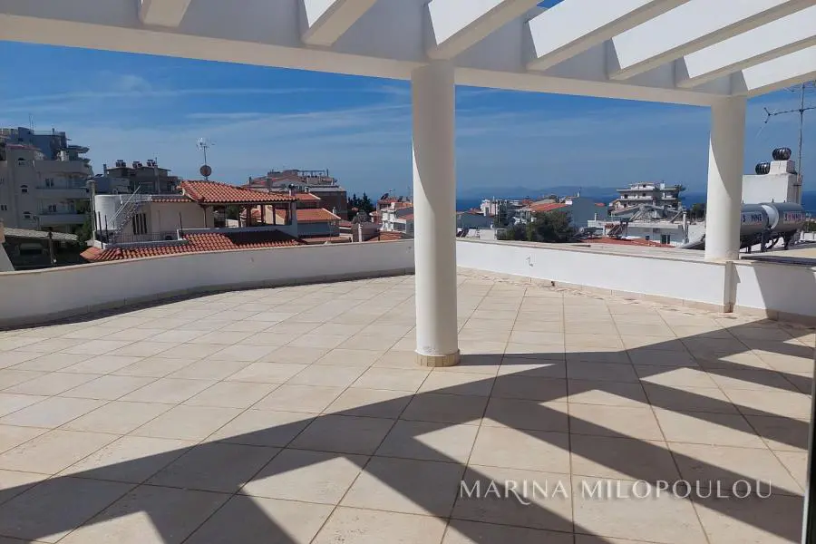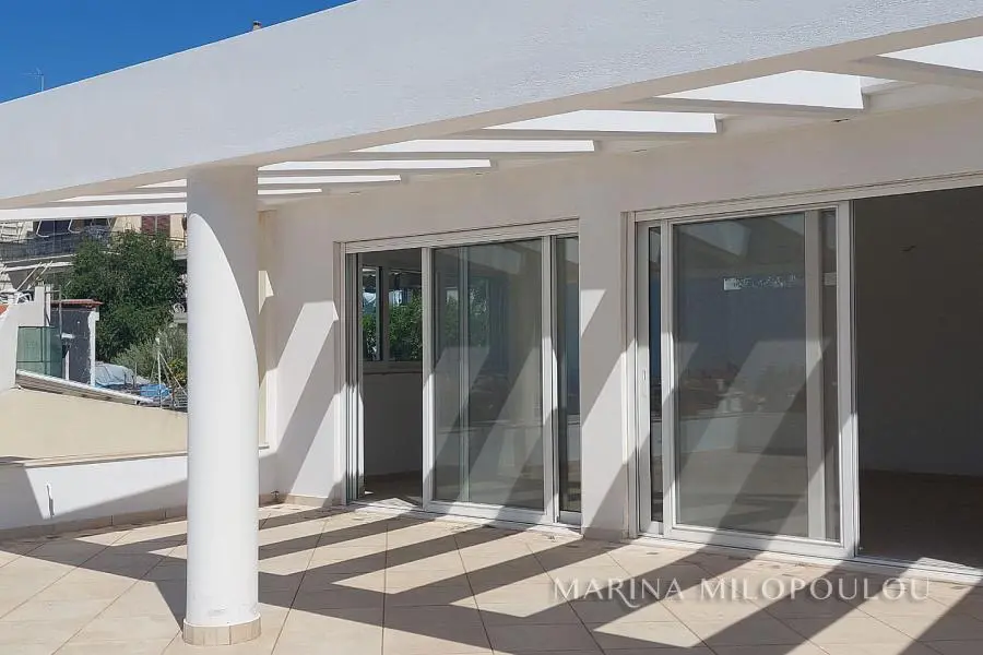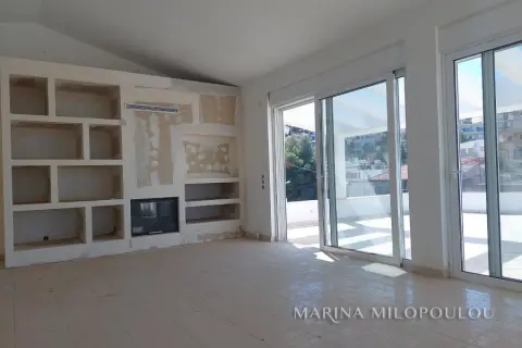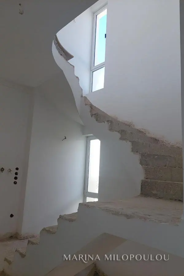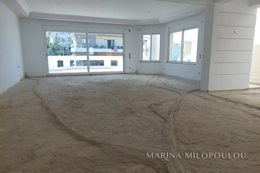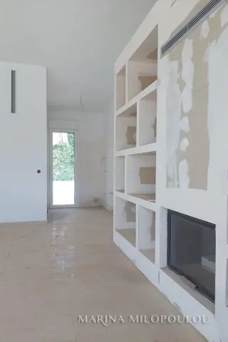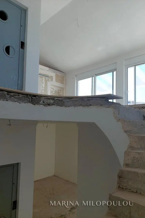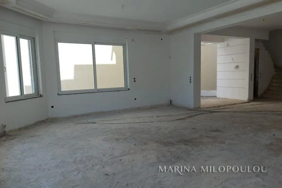 VOULA - Panorama, in the low zone, unfinished detached house of 4 levels, total area 537 sq.m., within a plot of 389 sq.m. Superstructure surface 425 sq.m. plus 113 sq.m. basement. - Raised ground floor, independent apartment, 104 sq.m. Reception area with open plan kitchen, 2 bedrooms, 1 bathroom, large front porch. -1st floor, 135 sqm, loft type with interior balcony, large reception area with fireplace, dining room, spacious kitchen, 1 wc, large veranda. -2nd floor, 131 sqm, 3 spacious bedrooms (1 master), 1 additional bathroom, 1 office and laundry room. - 3rd floor, 55 sqm single-room house with fireplace, 1 bathroom, kitchen pre-installation, large terrace with sea view. -Basement, 120 sq.m., 4-seater garage, warehouses and other auxiliary spaces. The house has been fitted with double glazing, shutters, plumbing, electrical lines and heating facilities, floors on the verandas and outside areas, the elevator mechanism (outside the cabin), plasterboards with hidden lighting and all wall surfaces have been plastered. Zone price €2500. The location of the property is excellent, quiet residential area with lots of greenery, on a gently sloping road very close to the square of Agios Nektarios (400 meters) with a cafe and Minimarket. Distance 2.2 km from Voula's cenetr, 3.5 km from the organized beach of Voula and 20 km from the intern. airport.
