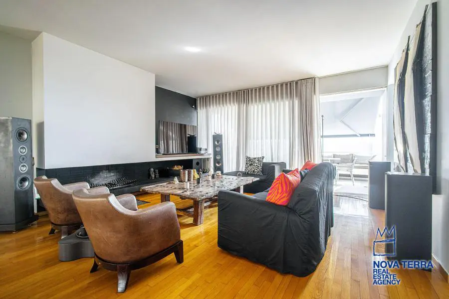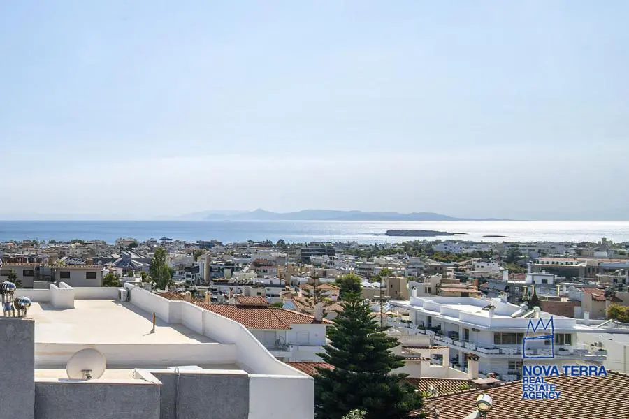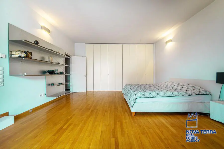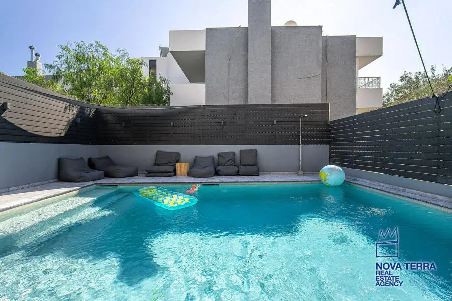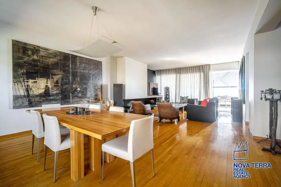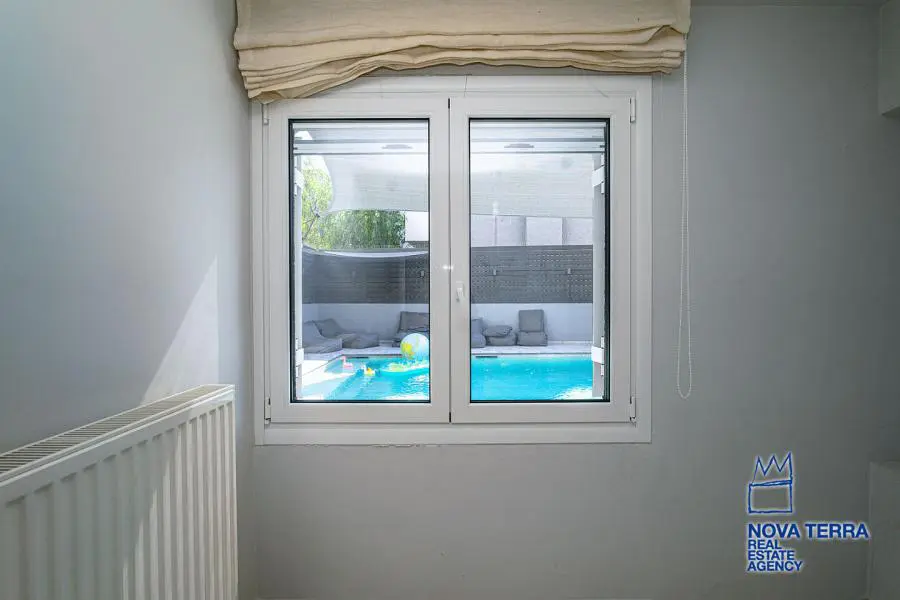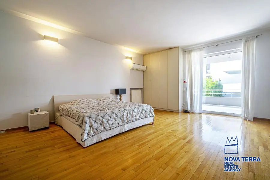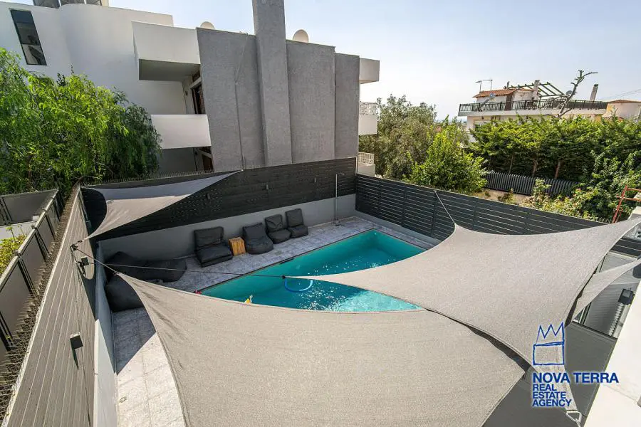 The property is set in a very convenient location, with wonderful sea views just 1km from the seaside, Athens Riviera, in a quiet neighbourhood with easy access to Voula center and the local market: bank branches, supermarket, grocery stores, liquor stores, small cafes and cozy restaurants. The front door leads into an extremely large master bedroom with two closets and en suite bathroom, which in turn opens up to the pool view balcony beyond. On the first floor there is a large living area and dining along with a vast fireplace with wooden floors built in luxury. The kitchen is fully equipped with premium brand units and granite worktops. From here sliding glass doors lead out to the sea view balcony for outside dining. On the top of the house there is an office which leads to the spacious terrace with the stunning view to the Saronic Gulf and the islands close to Attica area. On the ground floor there is a separately accessed guest apartment, with kitchen, bathroom, a playroom & 2 bedrooms all equipped with closets and windows with direct view and access to the pool. All 3 levels of the house are accessed both through hydraulic elevator and stairs. ID: 46349