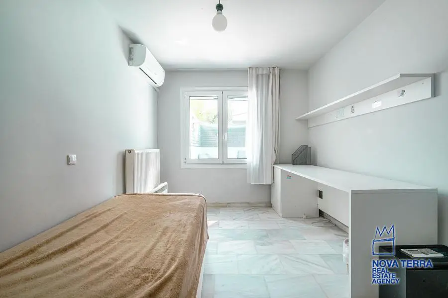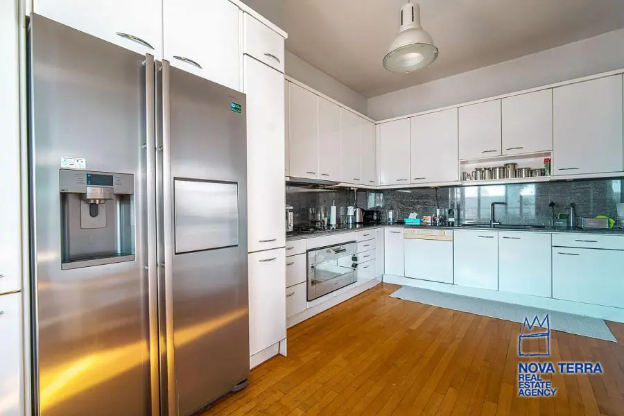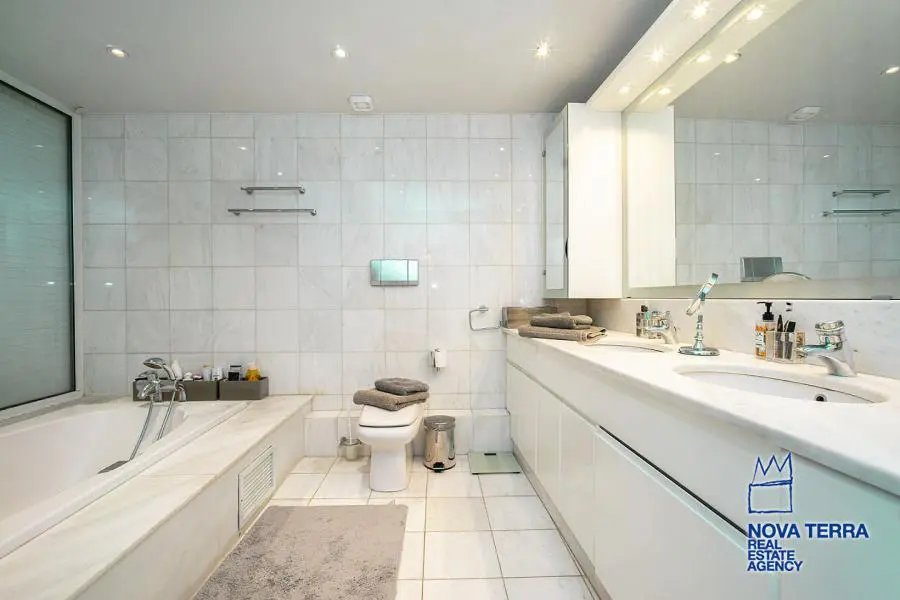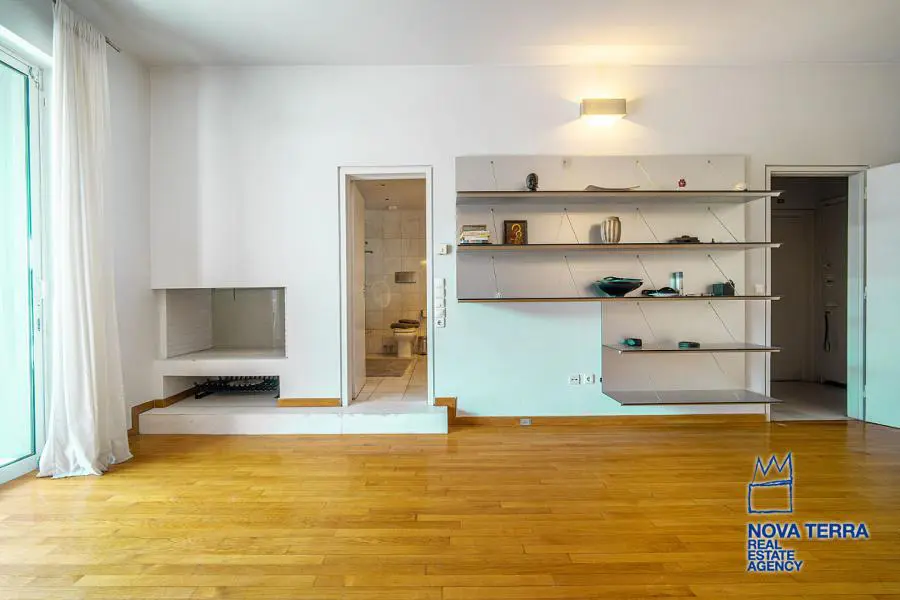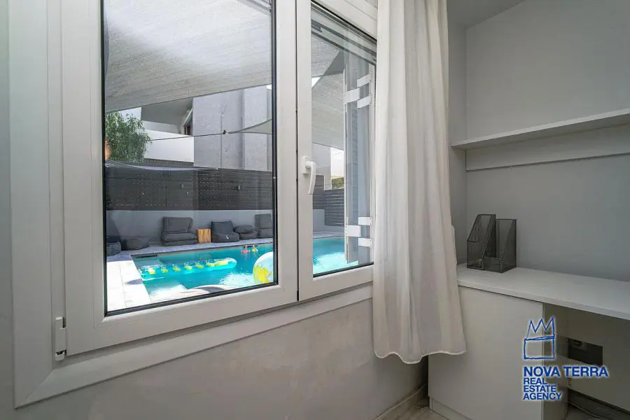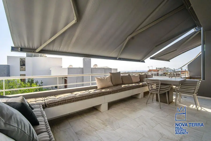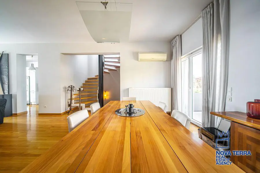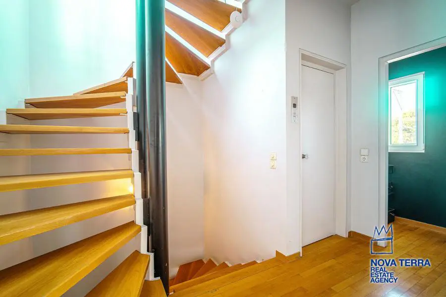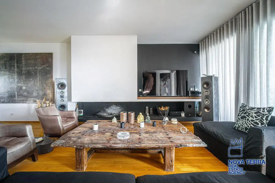 The property is set in a very convenient location, with wonderful sea views just 1km from the seaside, Athens Riviera, in a quiet neighbourhood with easy access to Voula center and the local market: bank branches, supermarket, grocery stores, liquor stores, small cafes and cozy restaurants. The front door leads into an extremely large master bedroom with two closets and en suite bathroom, which in turn opens up to the pool view balcony beyond. On the first floor there is a large living area and dining along with a vast fireplace with wooden floors built in luxury. The kitchen is fully equipped with premium brand units and granite worktops. From here sliding glass doors lead out to the sea view balcony for outside dining. On the top of the house there is an office which leads to the spacious terrace with the stunning view to the Saronic Gulf and the islands close to Attica area. On the ground floor there is a separately accessed guest apartment, with kitchen, bathroom, a playroom & 2 bedrooms all equipped with closets and windows with direct view and access to the pool. All 3 levels of the house are accessed both through hydraulic elevator and stairs. ID: 46349