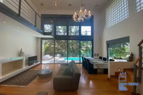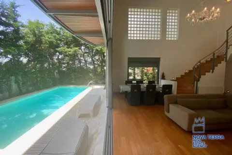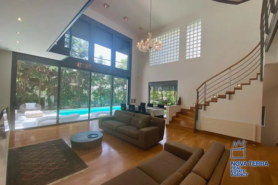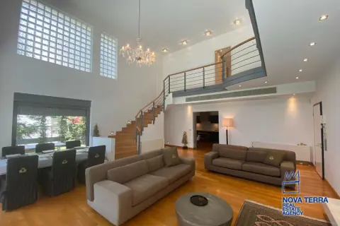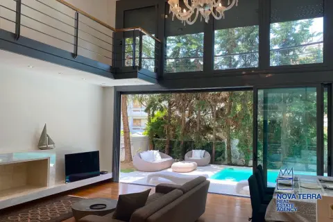 GLYFADA - EXONI, Duplex / Triplex Apartment,, Rental, 320 sq.m, on a plot of 250 sq.m, year built 200, 4 rooms, Ground Floor, Elevated, 1st, Various Characteristics: Balcony, Bath (3), Escalator, Fire Place, Furnished, Garden, Kitchen, Living room, Playroom, Store Room, Swimming Pool, Toilet, Master Bedrooms: 2 Master Bedrooms, Flooring: Wooden floor, Heating: Air Conditioning, Access road, Aluminium panels, Bright, Double-glazing, From Side to Side, Luxury, Minimal, Newly built, Painted, Residential area, Screens, Security Door, Solar Heating, In perfect condition: Energy class: B+. property ID: 49605, www.nova-terra.gr