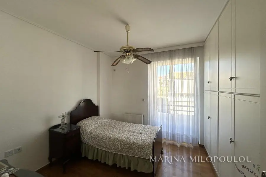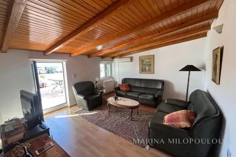 VOULA - Kalymniotika, Maisonette building, 3rd - 4th floor, 220 sq m. with sea view. - 3rd floor, 160 sq m, which includes a comfortable reception area with fireplace, dining room, separate kitchen with daily dining area, 3 spacious bedrooms, 2 large bathrooms, verandas in all rooms. - 4th floor, attic 70 sq m, with sloping roof, which in some places has a low height. It includes a living room with access to a large West-facing veranda with sea view, 1 bedroom, 1 office and 1 spacious bathroom. The entire residence is sunny, bright with comfortable verandas on both floors. It has a security door, oak floors in the bedrooms and beautiful cotto tiles in the rest of the rooms, independent oil heating, 5 A/Cs, elevator (up to the 3rd floor), double glazing, laundry area, loft above the bathrooms, 2 parking spaces in a row, alarm, all electrical appliances. Maintenance expenses 80€ It is part of a well-maintained building with a total of 4 residences. Available empty for 2500€ or furnished for 3000€. Small pet accepted. Just 800m from the center of Voula, 850m from the second beach of Voula, 5km from Asteras Marina.