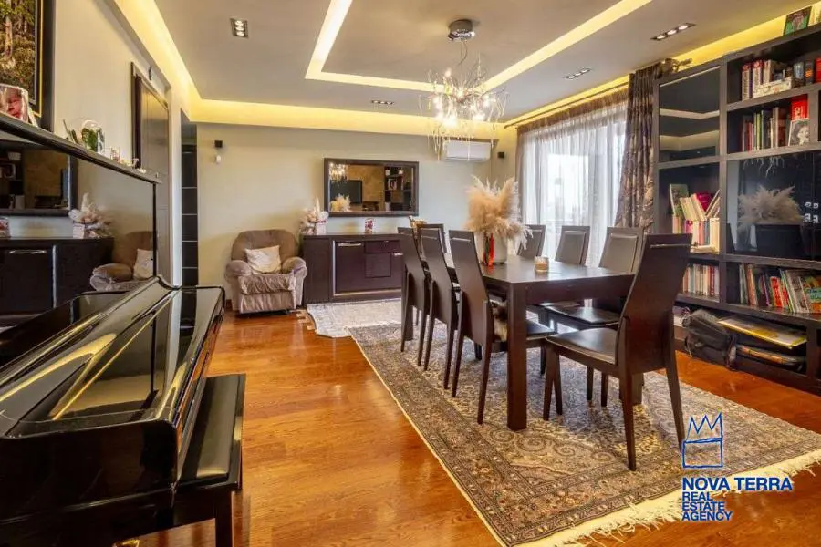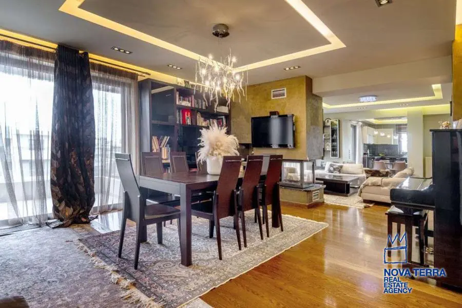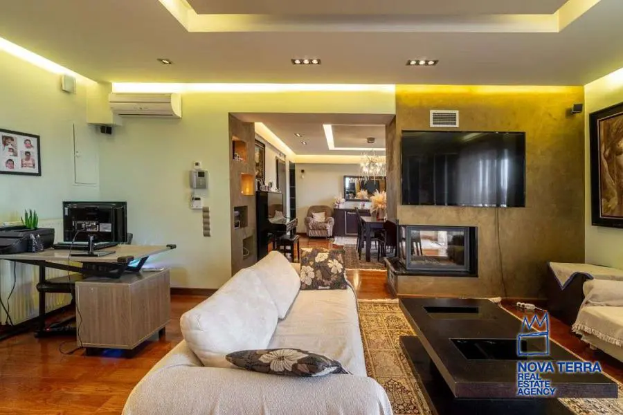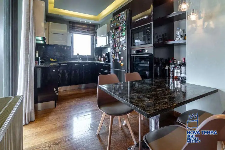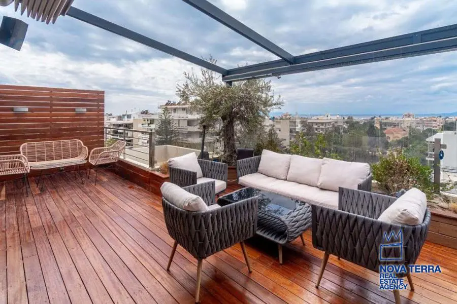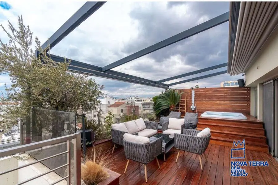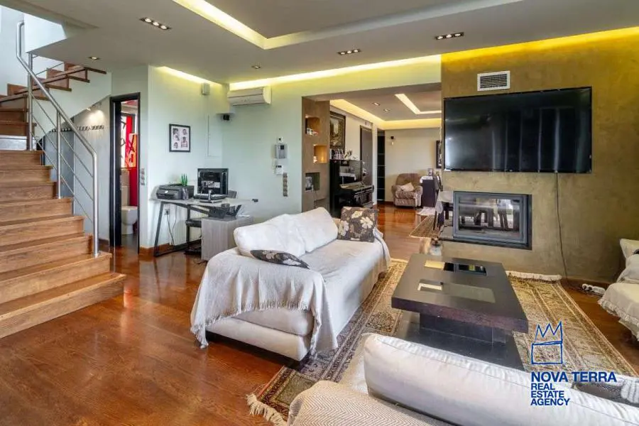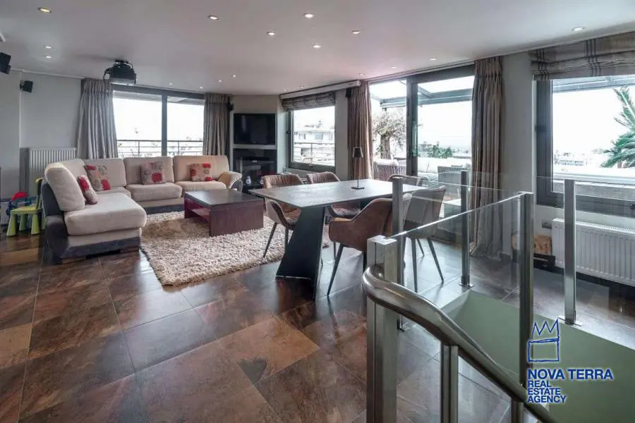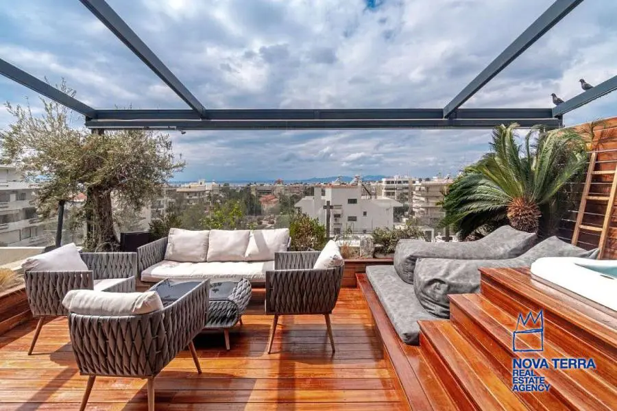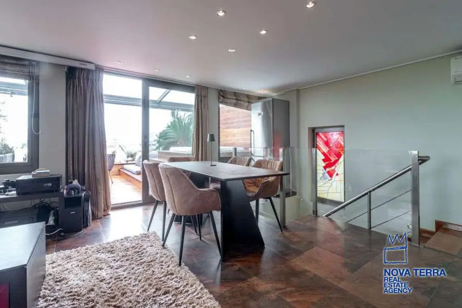 Luxurious Duplex/Triplex Apartment for Sale in Glyfada Center, 225 sq.m, Built in 2010 This stunning duplex/triplex apartment in Glyfada Center offers 225 sq.m of living space with 4 rooms on the 3rd and 4th floors. Enjoy breathtaking mountain and sea views from the balcony and various features such as 5 bathrooms, an escalator, fire place, kitchen, living room, and storage room. The apartment boasts 2 master bedrooms with tile and wooden flooring, air conditioning, autonomous gas heating, and double-glazed windows. Other highlights include an access road, aluminum panels, BBQ area, bright interiors, jacuzzi, and security door. This luxury property is in perfect condition and allows pets, with amenities like a satellite dish, parking area, and energy class B certification. Don't miss out on this opportunity - property ID: 52596, visit www.nova-terra.gr for more information.