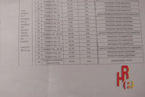 Office for sale (305 sqm + 75 sqm exterior) with 24 rooms and 2 bathrooms, distance 250 meters from Omonia Square. The property is bright and all rooms are on the facade, they have a window or a balcony door, most of them are separated from each other by a wall and others by plasterboard. The building is purely commercial, and there is no other property on the floor. Finally, the property has exclusive use of a 75 square meter terrace.