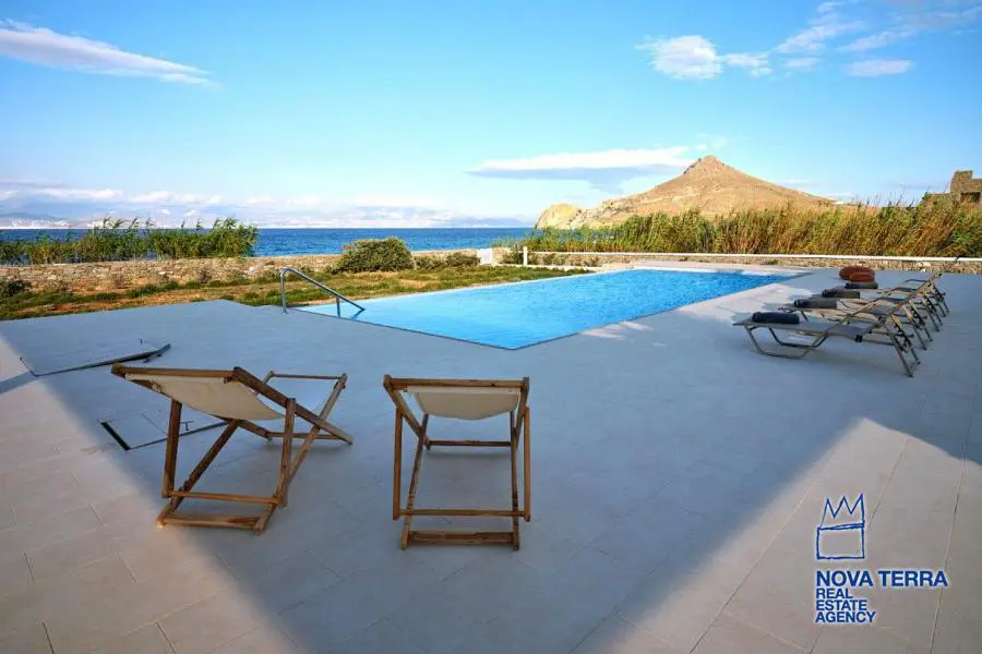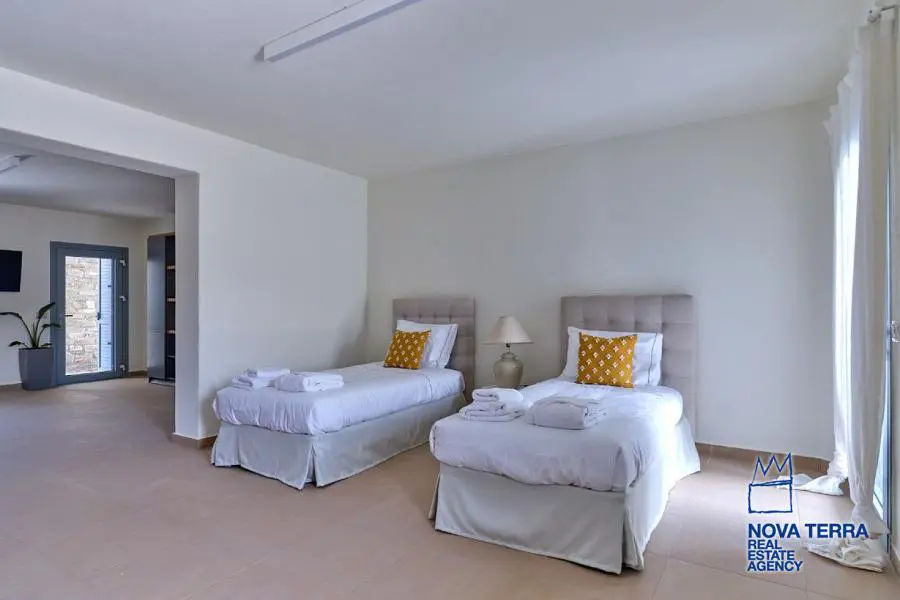 For sale in Paros, a luxurious villa with a total area of 520 sq.m on a spacious plot of 4000 sq.m. This stunning property was built in 2005 and features 7 rooms spread across the Ground Floor and 1st floor. Enjoy breathtaking sea views and unobstructed scenery from the balcony. The villa includes 5 bathrooms, a garden, kitchen, living room, store room, and toilet. The flooring is tiled and the heating is provided by air conditioning. Other features include access road, aluminium panels, bright interior, double-glazed windows, luxury finishes, painted walls, satellite TV, security door, and is located in a residential area near the seaside. The property is in perfect condition and allows pets. It also includes a satellite dish, parking area, and energy class B certification. Property ID: 52711. Visit www.nova-terra.gr for more information.