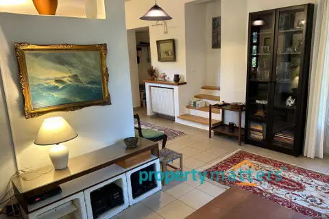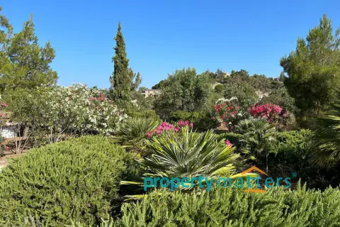 The 4,000 sq.m. property consists of two separate houses located 50 meters apart, surrounded by a mature garden. The plot is on level ground and just 170 meters from the sea. The first house is two stories and has a total area of 128 sq.m. The ground floor includes an open-plan living room and kitchen, a bathroom with a bathtub, one bedroom, and an internal storage room. The second floor features three bedrooms and a bathroom with a bathtub. All four bedrooms have built-in wardrobes. The house includes both internal and external staircases. The first floor has a terrace, while the ground floor is surrounded by covered and protected verandas. The second house is a single-story residence of 75.5 sq.m., consisting of an open-plan living room and kitchen, three bedrooms (two with built-in wardrobes), and a bathroom with a bathtub. This home also offers a large, shaded veranda ideal for outdoor dining. The property can be used as a family residence or divided into two or even three separate living units. Given the shortage of rental properties on the island, it could also serve as a reliable source of income. The layout of the two buildings and the mature garden filled with trees and shrubs ensure peace and privacy between them. Each house has its own electricity meter, heating system, and dedicated parking space. The two-story house also has the potential to be split into two smaller apartments — in fact, it is currently temporarily divided, with a separate apartment on the first floor. There are five external storage rooms on the property — three attached to the main house and two to the single-story house. There is ample space for a vegetable garden or further garden expansion. The mature trees and bushes offer shade and coolness during summer, year-round privacy, and a wonderful natural playground for children. The plot is just a ten-minute drive from the port of Korissia and five minutes by car from the popular, family-friendly beaches of Gialiskari and Otzias. It is only 170 meters from the sea and a five-minute walk from Vourkari — the charming seaside village with a marina, shops, cafés, tavernas, bars, and an ice cream parlor. It is also an ideal starting point for scenic walks or bike rides to the lighthouse, or for swimming and fishing around the nearby rocks and small beaches of Agia Irini and Kokka.