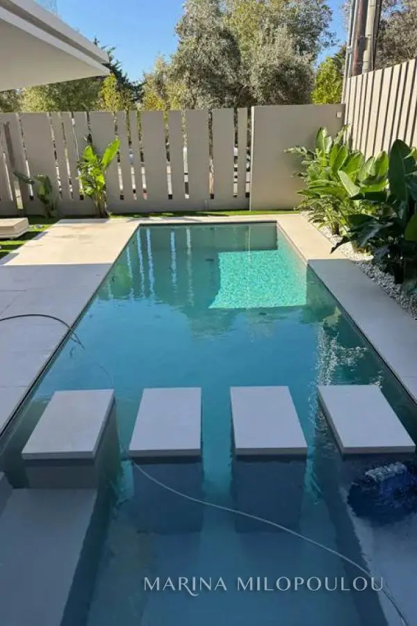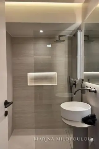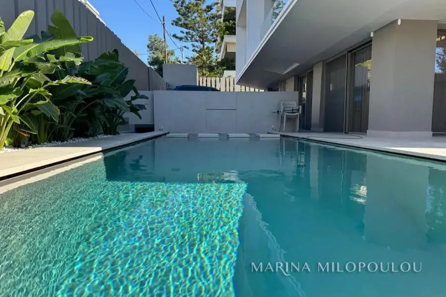 ΒΟΥΛΑ-Κάτω, Νεόδμητο, Επιπλωμένο οροφοδιαμέρισμα ισογείου, 97τμ, με ιδιωτικό κήπο και πισίνα. Αποτελείται από ενιαίο χώρο υποδοχής-τραπεζαρία με τζάκι υγραερίου, κουζίνα πλήρως εξοπλισμένη, 2 master υ/δ (το ένα με walk-in closet) και 1 επιπλέον μπάνιο. Αποτελεί μέρος σύγχρονου, γωνιακού, 3όροφου κτιρίου 4ων οροφοδιαμερισμάτων, ενεργειακής κλάσης Α+ Διαθέτει θερμαινόμενη πισίνα με αντίθετο ρεύμα και υδρομασάζ, ανεξάρτητη ιδιωτική είσοδο, Ιδιωτική θέση στάθμευσης (ανοικτή), ενδοδαπέδια θέρμανση και κεντρικό κλιματισμό με αντλία θερμότητας, ηλιακό θερμοσίφωνα, φωτοβολταϊκό σύστημα για σημαντική μείωση της κατανάλωσης ρεύματος, συναγερμό, κοινόχρηστο γυμναστήριο με hammam και sauna. Το διαμέρισμα θα κατοικηθεί πρώτη φορά. Κοινόχρηστα 150€/μήνα στα οποία περιλαμβάνονται η χρήση τoυ γυμναστηρίου και το Internet. Εξαιρετική θέση ακινήτου κοντά στα σύνορα με Γλυφάδα, απέναντι από πάρκο, σε απόσταση 400 μέτρων από τοπική αγορά, 1,2 χλμ από την Α πλαζ Βούλας, 1,5 χλμ από το κέντρο της Βούλας και από τον εμπορικό ιστό της Γλυφάδας.
