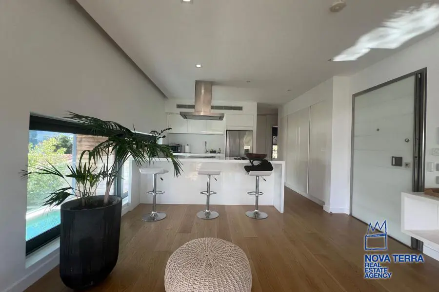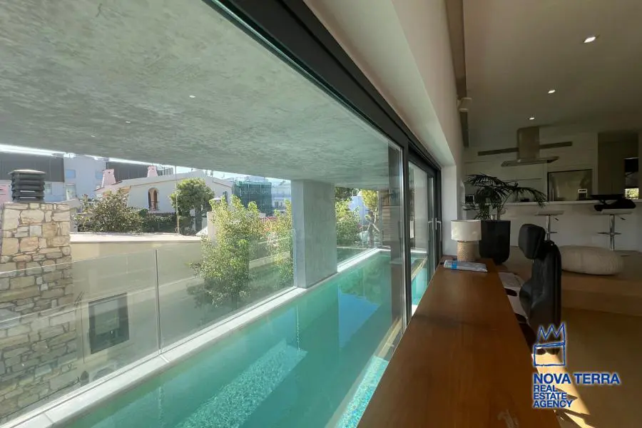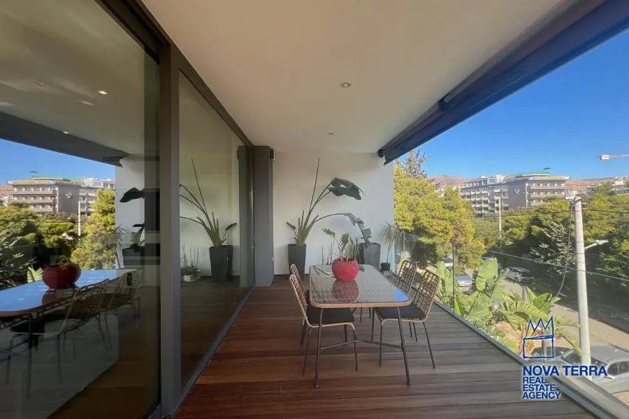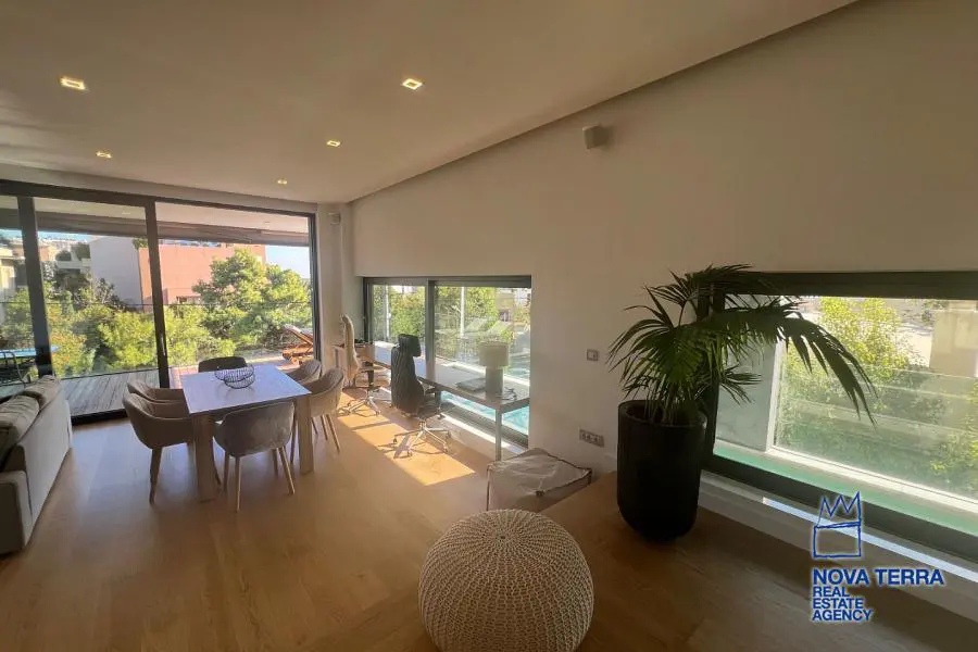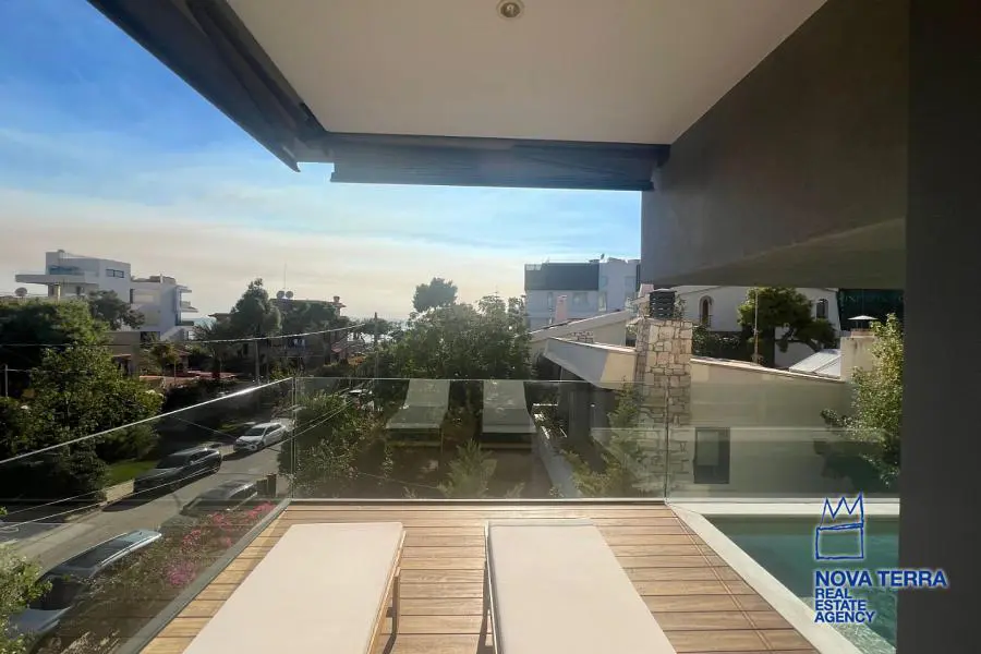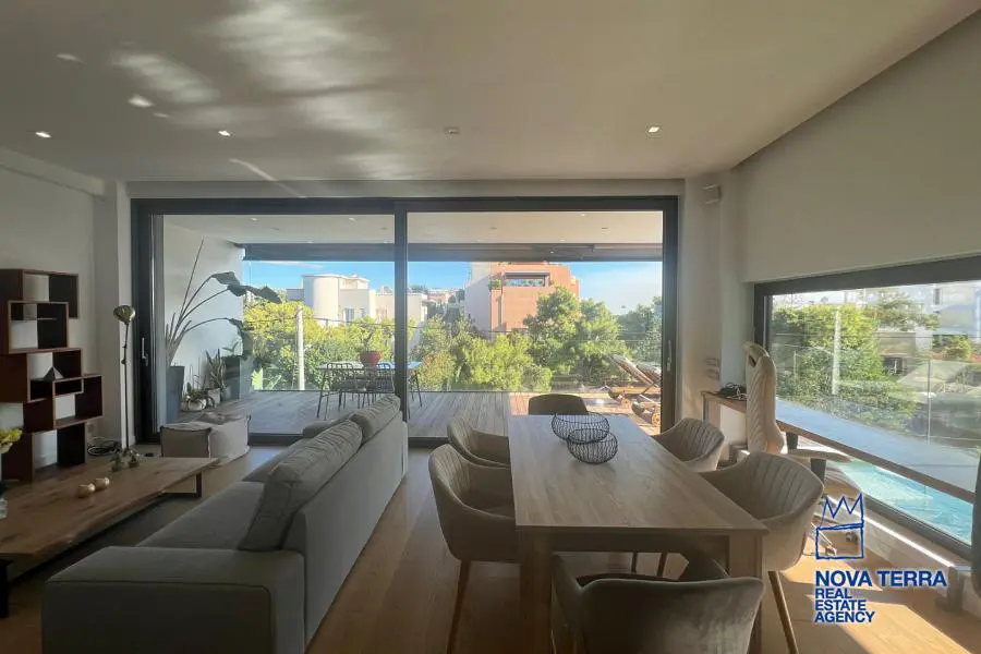 Οροφο-διαμέρισμα επιπλωμένο 2ου ορόφου κατασκευής του 2017, 115τμ. 80 μέτρα από την θάλασσα και 5 λεπτά περπατώντας από το κέντρο της Γλυφάδας. Το διαμέρισμα αποτελείται από 2 υπνοδωμάτια, ένα master un suite υπνοδωμάτιο και ένα δεύτερο με χρήση δικού του λουτρού. Το σαλόνι, τραπεζαρία και η κουζίνα βρίσκονται σε open plan διάταξη με θέα στην ιδιωτική πισίνα 18τμ. που βρίσκεται στο μπαλκόνι. Εσωτερικά, τα υλικά χρώματος λευκού σε συνδυασμό με το ξύλινο δάπεδο και το deck εξωτερικά, δημιουργούν μια φρέσκια και ευχάριστη ατμόσφαιρα, τονίζοντας ιδιαίτερα τον μοντέρνο και minimal αρχιτεκτονικό σχεδιασμό του διαμερίσματος. Περιμετρικά μεγάλα ανοίγματα επιτρέπουν την διάχυση φυσικού φωτισμού, ενώ υπάρχει η δυνατότητα σκίασης με την χρήση ηλεκτρικών σκιάστρων (τέντες) και ηλεκτρικά roller , ενώ ηλεκτρικά ρολά από την πίσω πλευρά του διαμερίσματος. Στο σαλόνι υπάρχει τζάκι βιοαιθανόλης, ενώ ο χώρος θερμαίνεται και ψύχεται με σύστημα ενδοδαπέδιας θέρμανσης/ψύξης με χρήση fan coil και αντλιών θερμότητας. Στο διαμέρισμα ανήκει μια θέση στάθμευσης στο υπόγειο garage, καθώς και μια αποθήκη 10τμ