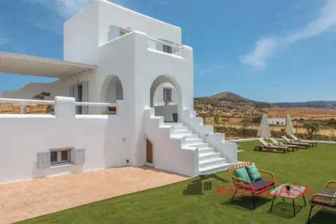 Naxos Island. A Magnificent Cycladic Holiday Villa Only 150m From The Sea. Built On 3 Levels, Inside A Secured Land With A Guardhouse At The Front Gate Entrance, Offering A Private Landscaped Garden With Bbq. Size: 162 Sq.m., 3 Levels Plot Size: 1556 Sq.m. 4 Bedrooms, 4 Bathrooms 2 Living Rooms, Pool, Bbq Sea View Balcony & Patio Wifi - A/c In All Rooms 2 Fully Equipped Kitchens Private Parking Area