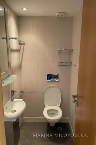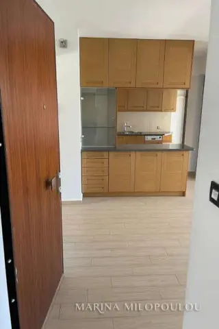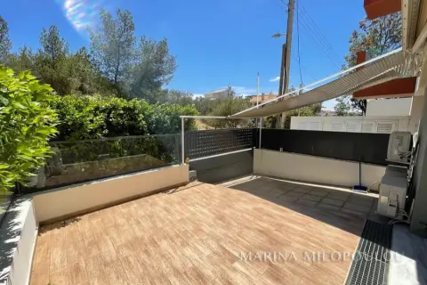 VOULA-Kalymniotika, Ground floor apartment, northeast orientation. It consists of a single reception-dining area with fireplace, kitchen with electrical appliances, 2 bedrooms, 1 bathroom and 1 wc. It features a security door, a heat pump, 2 A/Cs, double glazing, solar water heater, electric roller shutters, electric awnings, security alarm, 7sqm storage room, 2 parking spaces, one basement and one open. Maintenance expenses 25€. Zone price 2400€ Located infront of a green hill. in a very quiet, residential area with elegant houses. 450 m from a Deli market, 1.5 km from Voula's center, and from "Apollon Hotel" organized beach in Kavouri and 19 km from the intern. airport.