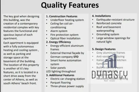 Third and forth Floor Apartment – 170.6 m², featuring a living room, kitchen, WC, and three master bedrooms, with the main master offering a large walk-in closet. Includes exclusive use of a rooftop terrace with a private pool (7.10 × 2.75 m), as well as an independent 27 m² studio/guest house in the basement and two underground parking spaces. Description: This residence is part of a modern residential complex designed with an emphasis on functionality, comfort, and refined aesthetics. The layout has been carefully planned to ensure spaciousness and practicality, while the construction is equipped with contemporary heating and cooling systems as well as two underground parking spaces. The location is also a key advantage, as Voula offers direct access both to the Athenian Riviera and to the main routes leading to the center of Athens. 1. Construction Features -Underfloor heating system -Ceiling fan coil air-conditioning -Alarm system -Fire protection system -Fiber optic installation 2. Energy Efficiency -Energy-efficient aluminum window frames -External thermal façade by German company STO -Smart home automation system -Solar panels -LED lighting throughout 3. Additional Features -Electric vehicle charging station -Parquet flooring -Three-phase power supply 4. Installations -Earthquake-resistant structure -Reinforced concrete -Roof and basement waterproofing -Grounding system -Large window openings allowing abundant natural light 5. Design Elements -Grey aluminum frames -Anti-vandalism glazing -Italian-designed kitchen -Built-in sanitary ware -Wall-hung toilets -Large-format tiles -Recessed / hidden lighting Property Code: 319 dynastyrealestate.gr
