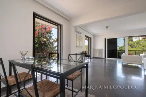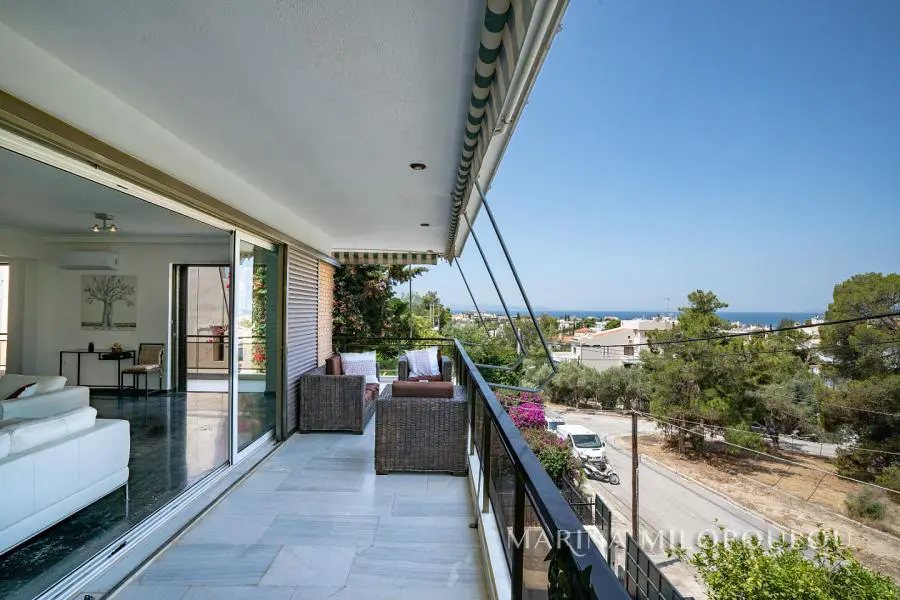 VOULA - Pigadakia, a 2nd floor apartment, 145 sq m, at the border with Vouliagmeni with fabulous sea view. Spacious reception - dining area with fireplace, separate renovated kitchen with electrical appliances, 3 spacioun bedrooms, 1 study, 2 renovated bathrooms and large verandas with beautiful views. The apartment features oak floors in the bedrooms and marble in the rest areas, oil autonomous heating (also per room), 3 A/Cs, double glazing in the living room, 2 storage lofts above the bathrooms and a 2 sqm storage room on the ground floor, parking space in the yard. It is part of a well-maintained, 4-story building with a total of 4 properties, an elevator and beautiful garden. Maintenance expenses aprox. 40€. It is offered semi-furnished or empty. This elegant residence offers open sea views and a tranquil, elevated setting with direct access to a pine-covered hill, providing a unique sense of countryside living just 850 meters from the coastline. Distance 1.3 km from the organized beach of Apollon Beach Hotel in Kavouri, 2 km from Voula's center, 3 km from Vouliagmeni and Varkiza, 5 km from the shopping area of Glyfada and 18 km from the intern airport. Exclusive property.