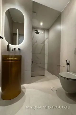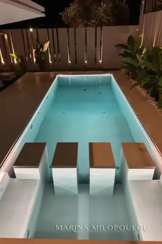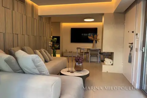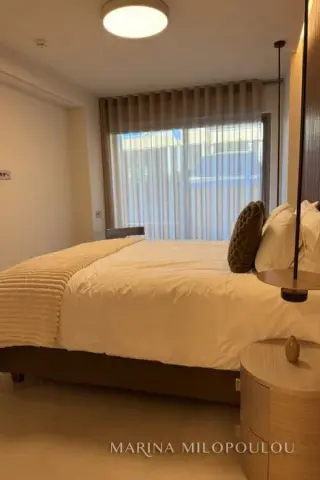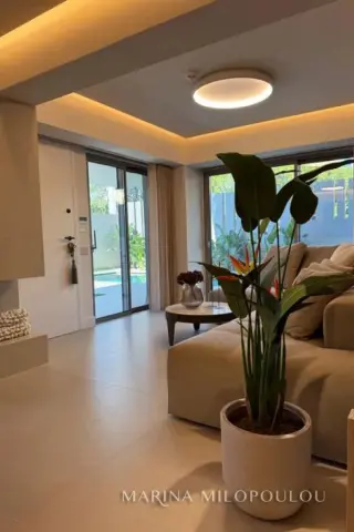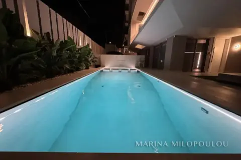 Voula, α newly built, furnished ground-floor apartment of 97 sq.m. with a private garden and swimming pool. It consists of a reception–dining area with gas fireplace, a fully equipped kitchen, 2 master bedrooms and 1 additional bathroom. It is part of a modern, corner, 3-storey building with 4 floor-apartments, energy class A+. It features a heated pool with counter-current system and jacuzzi, a private independent entrance, security alarm, private (open air) parking space, underfloor heating and central air conditioning with heat pump, double glazing, nets, solar water heater, and a photovoltaic system for significant reduction in electricity consumption. There is also a shared gym with hammam and sauna. The apartment will be inhabited for the first time. Monthly common charges are €150, which include the use of the gym and Internet connection. Excellent location near the border with Glyfada, opposite a park, 400 meters from the local market, 1,2 km from Voula's organized beach and 1.5 km from the center of Voula and from the shopping area of Glyfada.