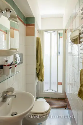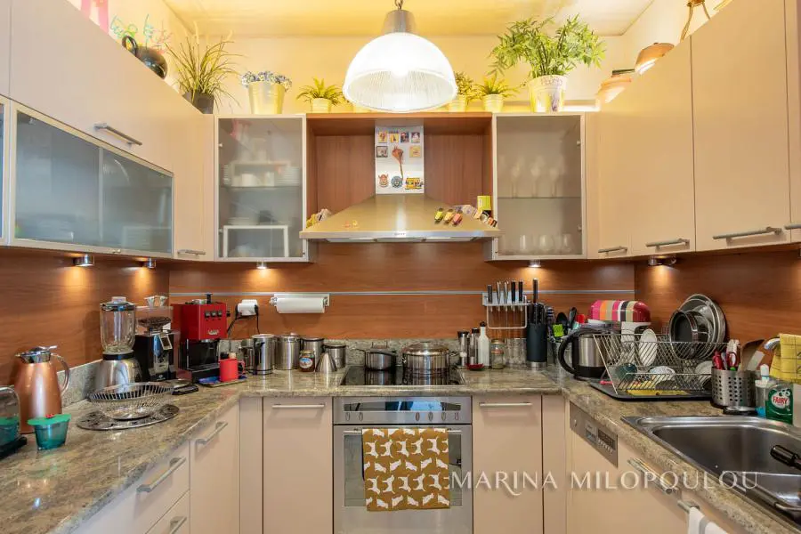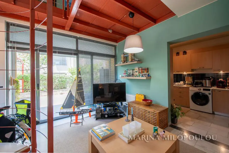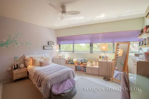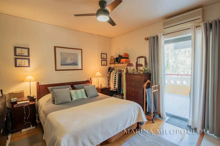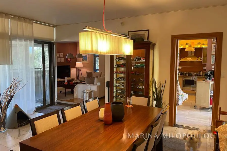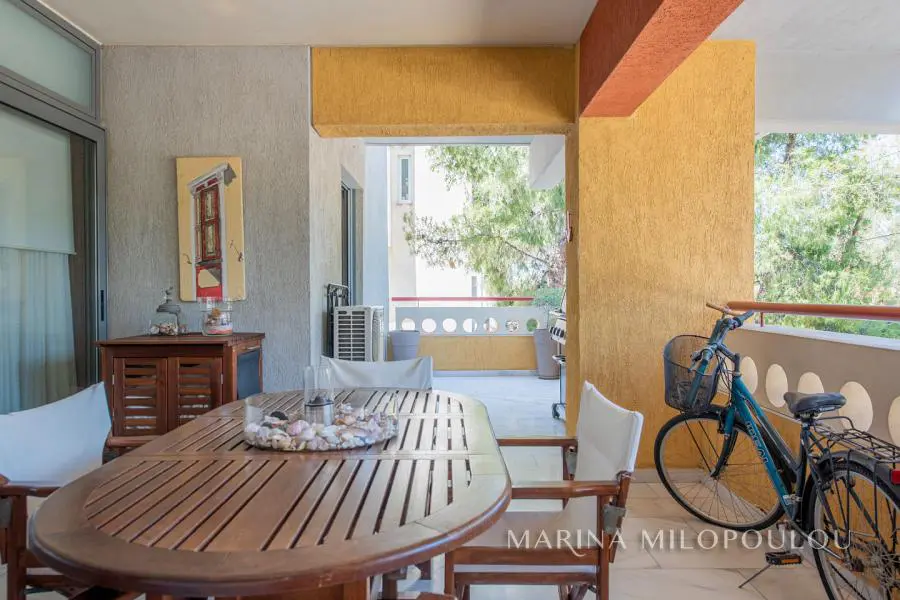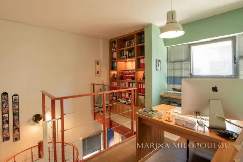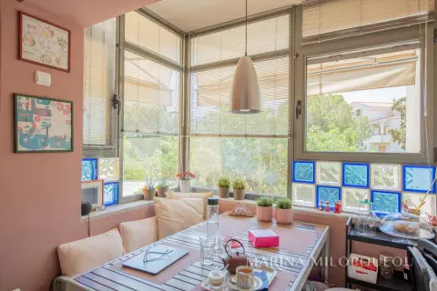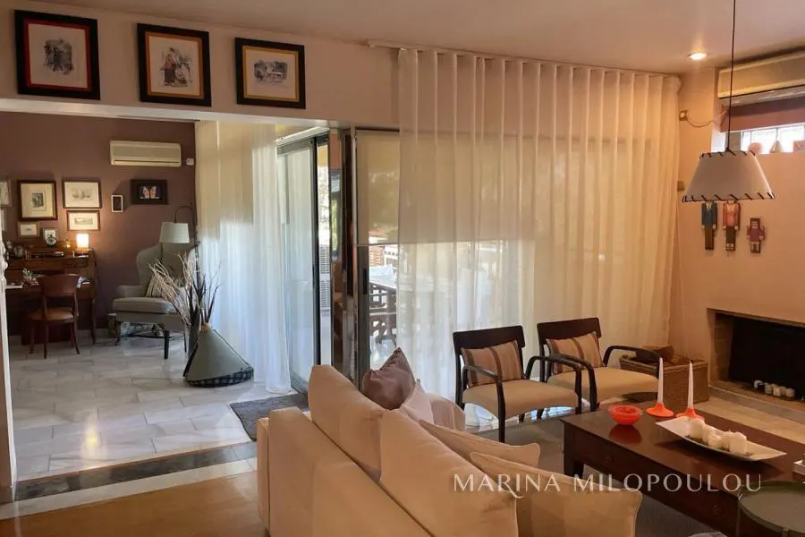 VOULA, 600m from the sea, a 1st floor apartment with ground floor studio, total area 180 sq m. Reception-dining area, separate kitchen with small living room, 2 bedrooms (1 master), 1 additional bathroom, 1 office space, large front veranda. It features a security door, double glazing, screens, autonomous oil heating, solar water heater, fireplace, 5 A/Cs, oak floors in the bedrooms and marble in the rest of the rooms, alarm, built-in electrical appliances, large verandas, 8sqm storage room, 2 outdoor parking spaces with open horizon, green view and north orientation. The ground floor studio of 40 sq m, consists of an open-plan living room with kitchenette, 1 bedroom and 1 bathroom. It is accessed via an internal staircase, but can also function independently as a guest house or office, thanks to its private entrance and direct access to a secluded part of the garden, where two covered parking spaces are located. The apartment is located on a light traffic street, within walking distance of the organized beach of Voula, 500m from a local market, 950m from a sandy public beach, 1.2 km from the center of Voula, 2.5 km from the shopping area of Glyfada, 6 km from the Hellinikon Metropolitan Park and 22km from Athens airport.