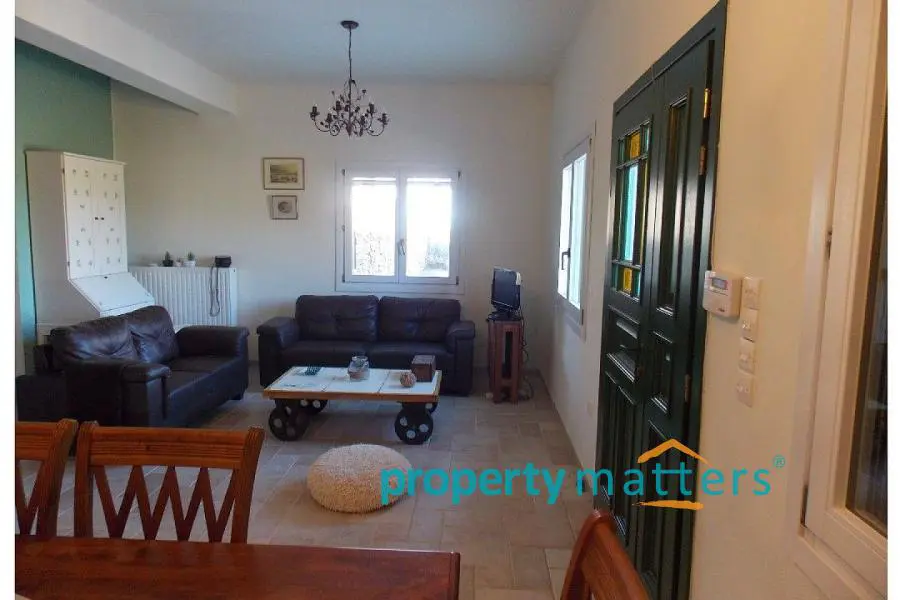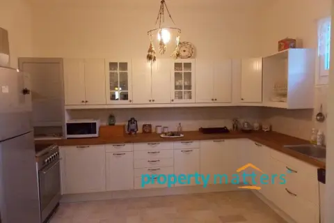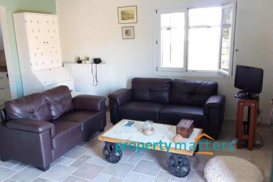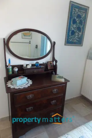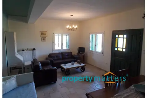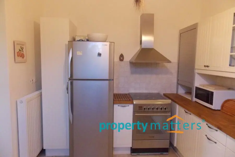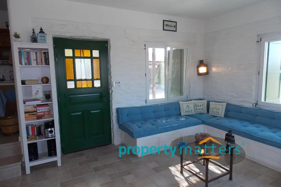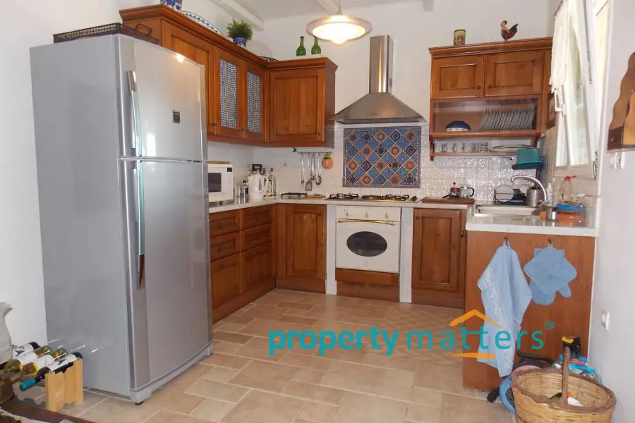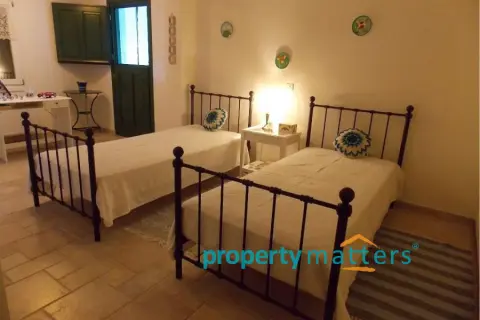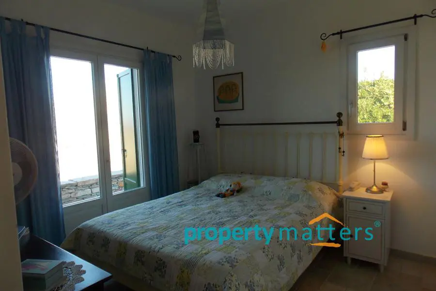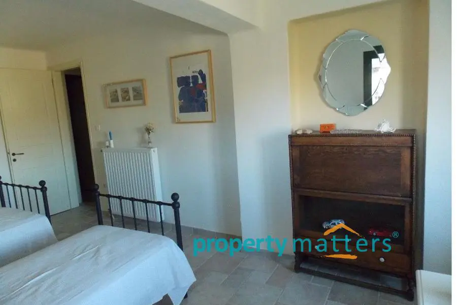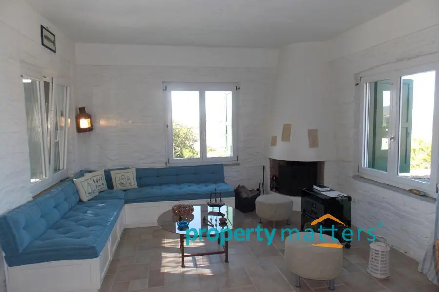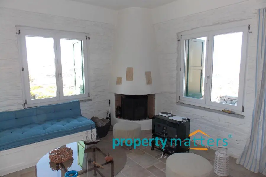 Kea (or Tzia) is a picturesque Cycladic island, just one hour away from the port of Lavrio. Conveniently located, it is only a 30-minute drive from Athens airport to Lavrio. Tzia’s landscape is characterized by rolling hills and valleys covered with fragrant bushes and royal oak forests, providing a refuge for local wildlife. The island is dotted with aromatic herbs that line its ancient, well-marked paths, making it a popular destination for walkers. Around the island, you’ll find numerous pristine beaches with crystal-clear waters and idyllic scenery that meet and exceed the criteria for a "Blue Flag" nomination. Kea is also home to archaeological remains from the Paleolithic era, whitewashed chapels, stone windmills, and an impressive monastery that overlooks the Aegean Sea. Korissia, a lively port just 10 minutes away, offers an ideal setting for evening strolls and dining. The island's capital, Ioulida, located 20 minutes away atop the island, boasts narrow, winding cobblestone streets and traditionally built houses, offering architectural interest. For seafood lovers and those seeking a vibrant nightlife, Vourkari, a small yachting marina just 5 minutes away, is the perfect spot with its seafood tavernas and lively ambiance. The villa is situated in the northern bay of Otzias, perched at an altitude of 160 meters, offering stunning views of the sea. Otzias, just 6 kilometers from Korissia and 3 kilometers from Vourkari, is a peaceful seaside village with a long sandy beach that is ideal for families with children. This two-story villa sits on a private 4,500 sq.m. plot, featuring a 90 sq.m. guest house on the upper floor and another 110 sq.m. living space on the lower floor. Each house includes two bedrooms, one bathroom, a spacious living room, a dining area, and a fully equipped kitchen. The villa’s expansive verandas provide breathtaking views: to the south, you can see Vourkari Bay and its lighthouse; to the northwest, the sandy arc of Otzias Bay; and to the north, the rising Cycladic hills. The climate in this area is sunny, dry, and breezy, making summer days comfortable and winter days mild. The villa is built on a terraced hillside, surrounded by a serene, rural atmosphere with only the occasional song of finches and partridges to break the silence. Constructed in 2003, the villa blends harmoniously with the traditional island architecture, using local stone while incorporating modern living conveniences. The property is enveloped by a Mediterranean garden and shaded, stone-paved courtyards. Additionally, there is permission for the creation of a swimming pool, further enhancing the comfort and luxury of this exceptional home.
