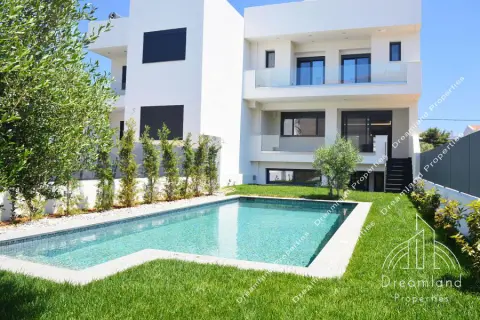 VARI - MILADEZA Detached House for Sale, 400 sq.m on a 375 sq.m plot, built in 2022. Features 4 rooms on the Ground Floor and 1st floor. Heating options include Air Conditioning, Fire Place, heating pumps, and Independent Heating. Condition is new build. Includes Underground parking space with A+ rating. Additional features include Electric Roller Windows, Garden, Play Room, private swimming pool, Security Alarm, Security Door, Solar Heating, Storage Room, and Wooden Floors. Property ID: 12977. Visit casarealestate.gr for more information.