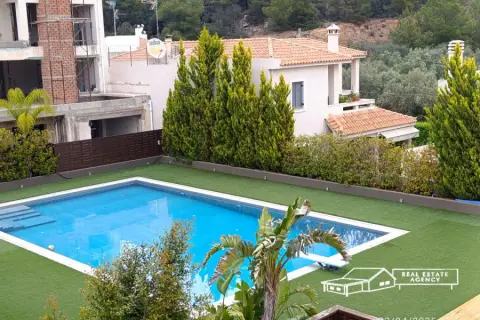 Varkiza-Kamini, in a lovely area with luxurious villas and maisonettes, just 5 minutes from the sea an unfinished house of 388 sqm is available for sale, built on a plot of 300 sqm. The house is part of a complex with a big, common swimming pool. It consists of a living room with fireplace and separate kitchen, 4 bedrooms, a playroom with separate entrance and outdoor space and direct access to the swimming pool, storage rooms and underground parking. The house can also be sold key ready with a selling price of 1,350,000 euros. It needs around 5 months to be completed. Contact phone: +30 6932 746491, website: www.merryland.com.gr, Email: [email protected], Id: 15613