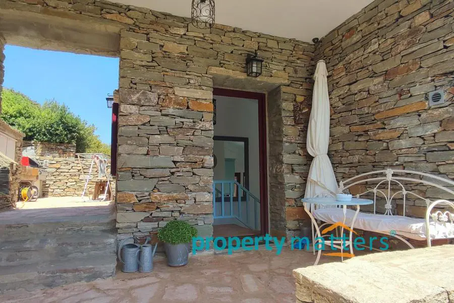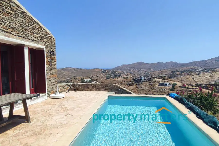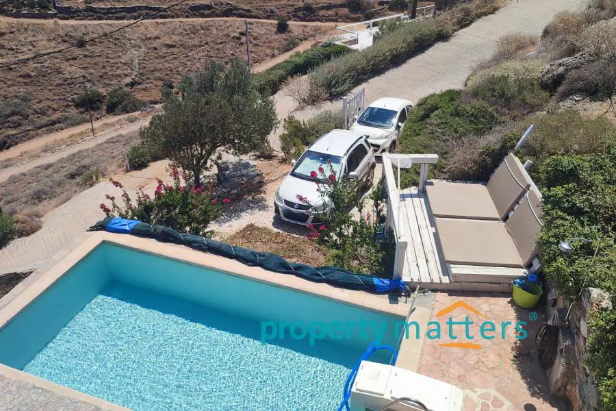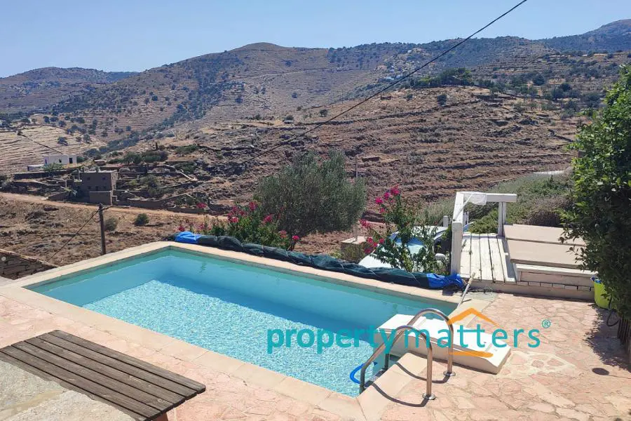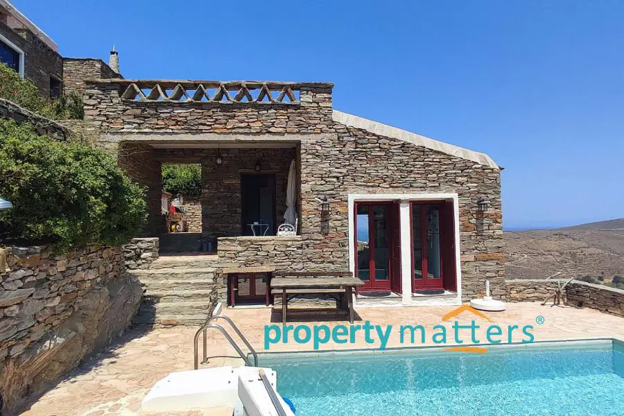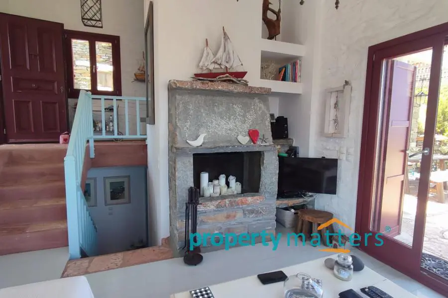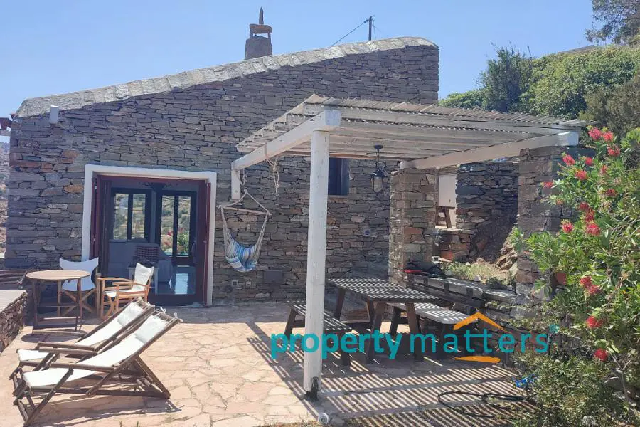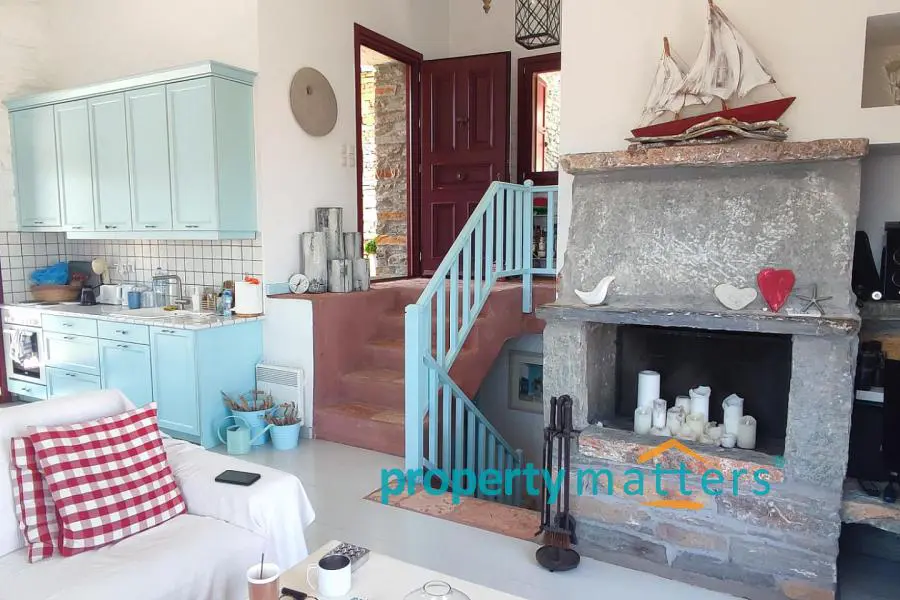 Stone-Built Detached House – 105 sq.m. on 1,111 sq.m. Plot (Part of 4,242 sq.m. Shared Property) A fully stone-built house of 105 sq.m., situated on a 1,111 sq.m. plot within a 4,242 sq.m. co-owned estate. The residence features a tiled multi-level roof and offers stunning views of both the sea and the main town (Chora). Located just 1,000 meters from Vourkari. Layout: Ground Floor: Living room, kitchen, stone-built fireplace, and a WC with shower. Upper Floor: Two full-sized bedrooms with built-in wardrobes, one smaller bedroom also with a built-in wardrobe, and a main bathroom. Outdoor Areas: Sheltered 6x3m swimming pool with decking on one side and a pergola with garden seating on the other. Panoramic views of the town from the pool and sea views from the pergola area. Large gas BBQ, outdoor and indoor storage rooms. Additional Features: Fully furnished and in excellent condition Built-in kitchen appliances Large water storage tank (including rainwater collection) Wooden window frames with double glazing and insect screens Independent electric heating in each room Wooden flooring on the ground floor