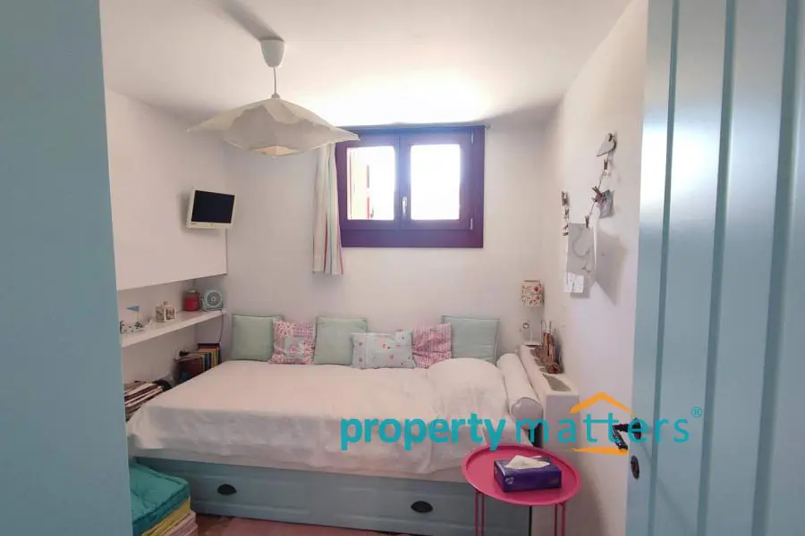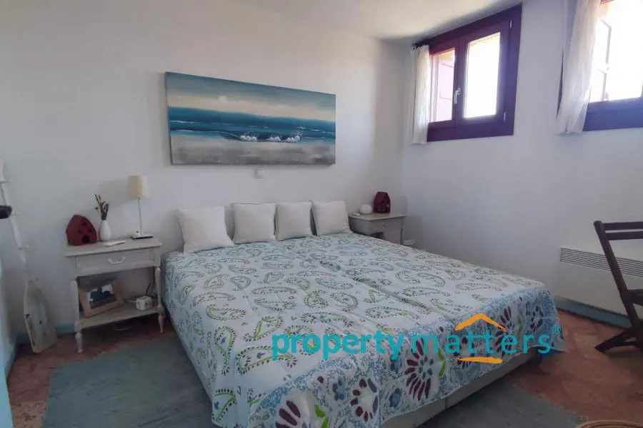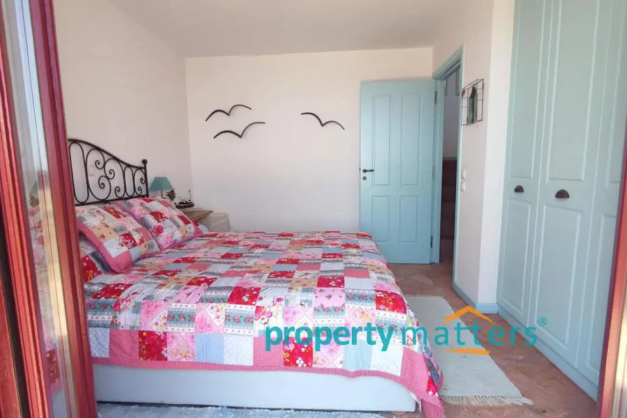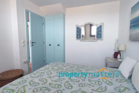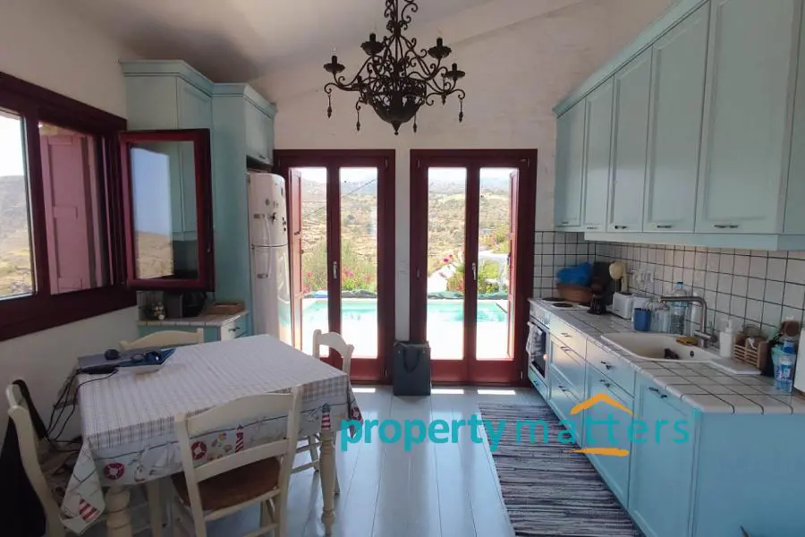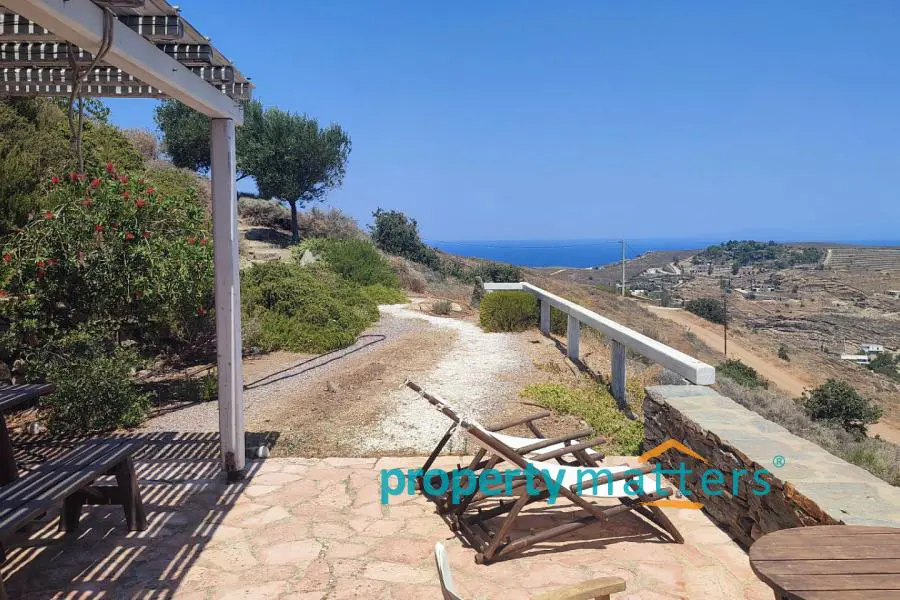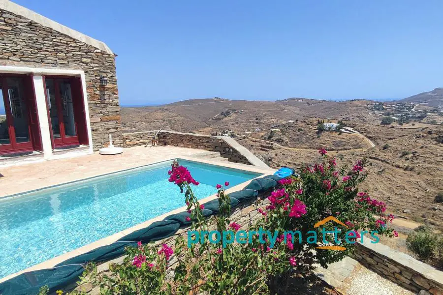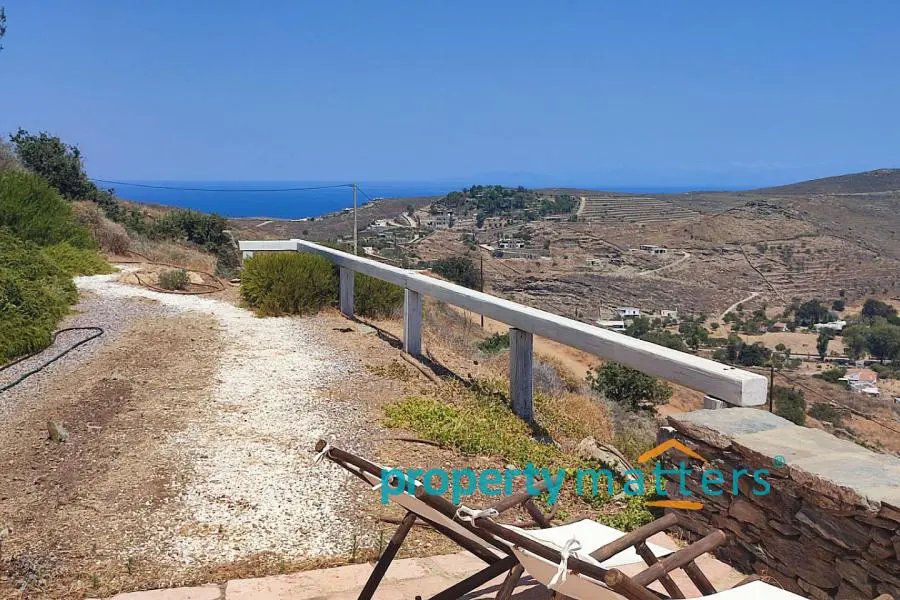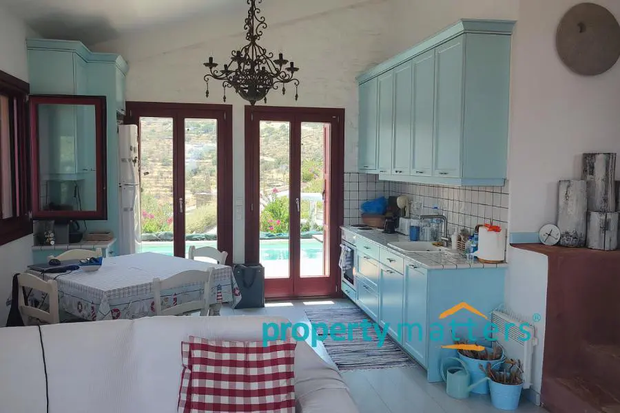Stone-Built Detached House – 105 sq.m. on 1,111 sq.m. Plot (Part of 4,242 sq.m. Shared Property) A fully stone-built house of 105 sq.m., situated on a 1,111 sq.m. plot within a 4,242 sq.m. co-owned estate. The residence features a tiled multi-level roof and offers stunning views of both the sea and the main town (Chora). Located just 1,000 meters from Vourkari. Layout: Ground Floor: Living room, kitchen, stone-built fireplace, and a WC with shower. Upper Floor: Two full-sized bedrooms with built-in wardrobes, one smaller bedroom also with a built-in wardrobe, and a main bathroom. Outdoor Areas: Sheltered 6x3m swimming pool with decking on one side and a pergola with garden seating on the other. Panoramic views of the town from the pool and sea views from the pergola area. Large gas BBQ, outdoor and indoor storage rooms. Additional Features: Fully furnished and in excellent condition Built-in kitchen appliances Large water storage tank (including rainwater collection) Wooden window frames with double glazing and insect screens Independent electric heating in each room Wooden flooring on the ground floor