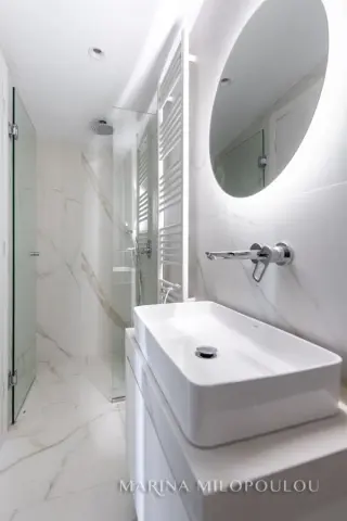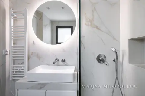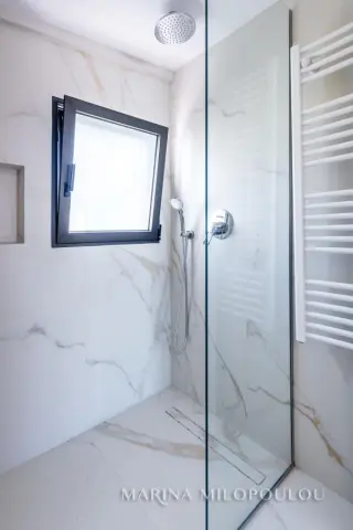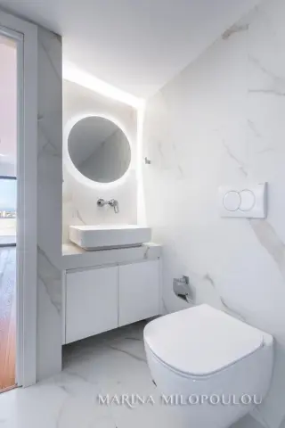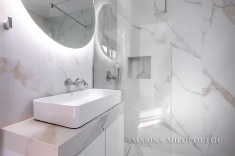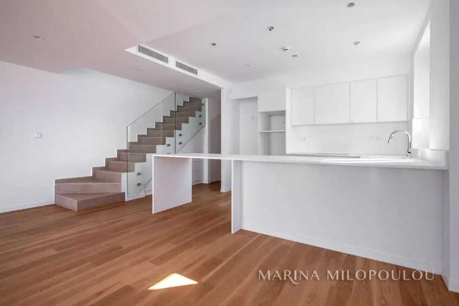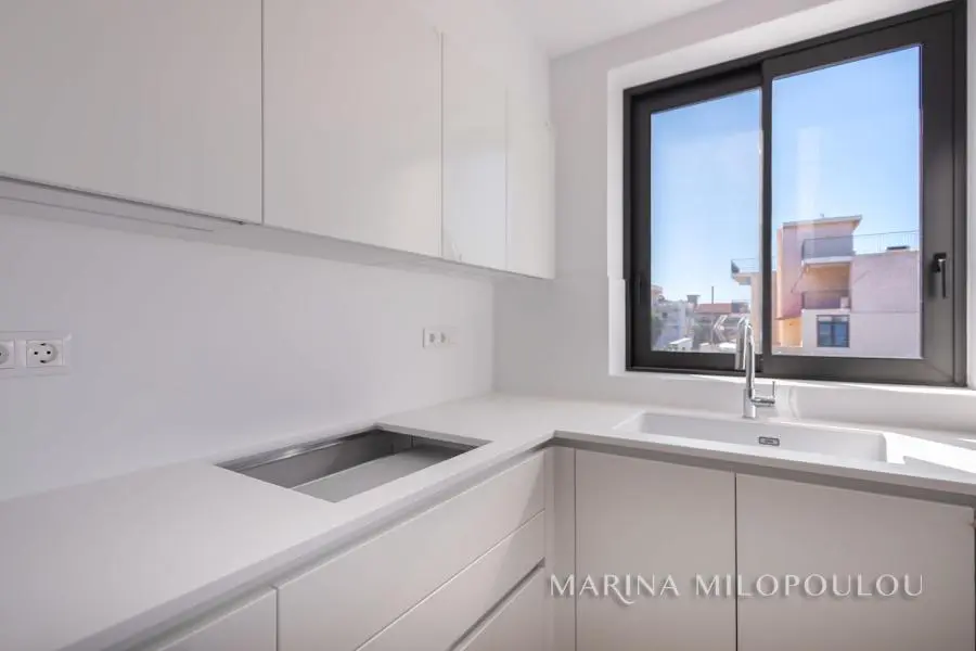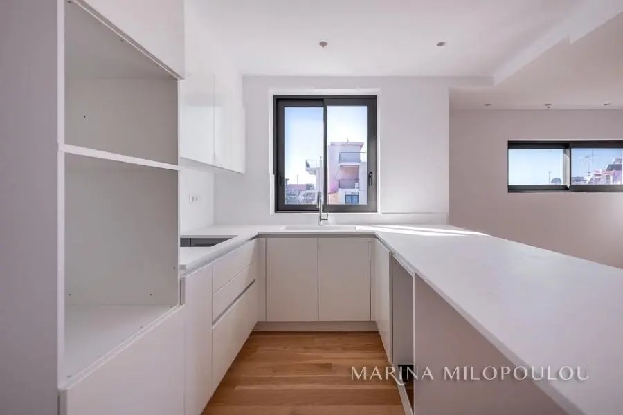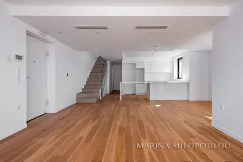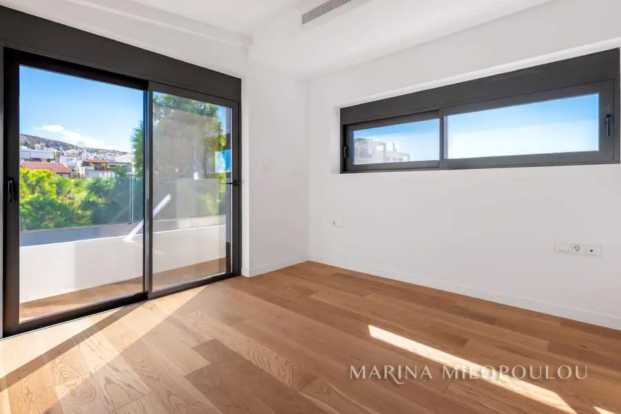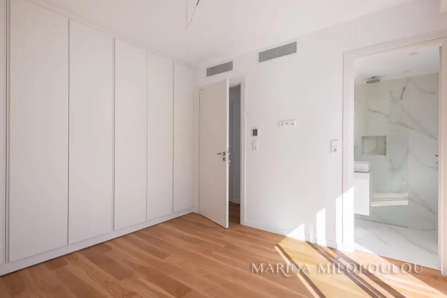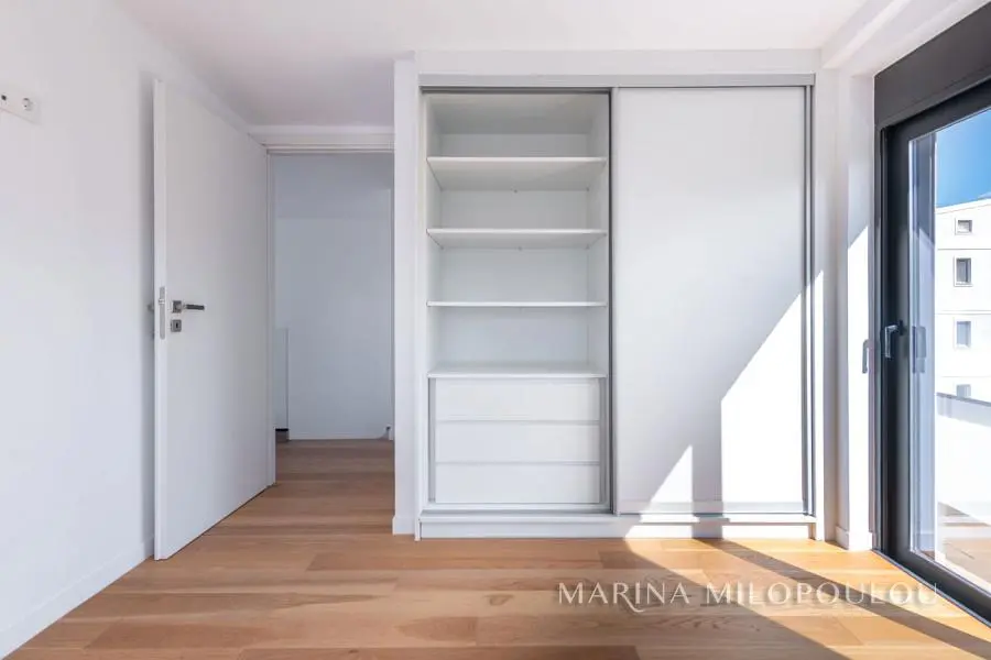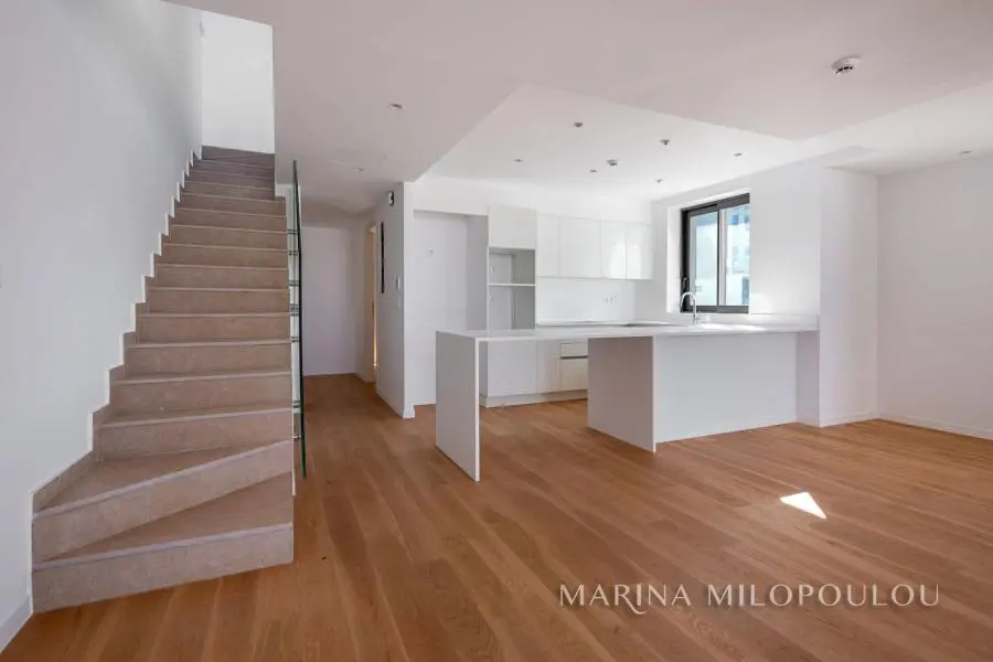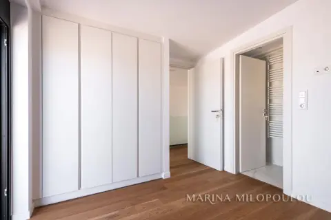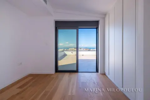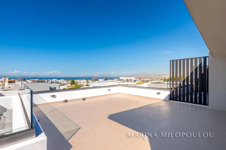 VOULA-Digigarika, a 2 level newly built maisonette, on the 3rd - 4th floor, total area 133 sqm, with sea view from both levels. - 3rd floor 90 sq m, reception - dining area, open plan kitchen, 1 master bedroom, 1 wc, wardrobe under the stairs and veranda with sea view. - 4th floor 43 sqm, (Internal staircase access only), 2 bedrooms (one of which is a master with a large terrace with unlimited sea view), 1 additional bathroom. It features a security door, solar water heater, central air conditioning for cooling / heating, intercom, oak floors, thermalberak aluminum frames, screens, electric shutters, alarm pre-installation, satellite antenna, night current, underground parking space with elecrtic car charger. Zone price 2600€. It is part of a 4-storey building, in a quiet neighborhood and close to a school and bus stop. Distance 600m from a big S/M and from the Glyfada's tennis club, 1.6km from the center of Voula, 2km from "Athines by the sea" beach of Voula, 2.4km from the shopping area of Glyfada, 2.8km from the 5* beach of the "One and Only Resort" and 20 km from the intern. airport.