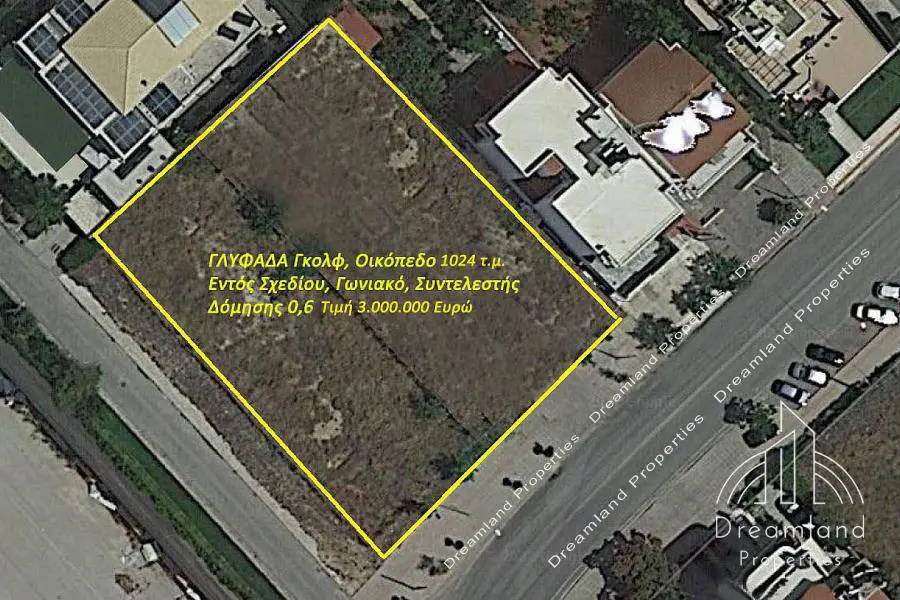 GLYFADA Golf, Land Plot 1.204 sq.m., Within Urban Plan, Corner Plot, Building Coefficient 0.6, Price 3.000.000 Euros (Listing code: 2602). "Dreamland Properties" Office: +30 21210.46321 Mobile: +30 6951.341780 WhatsApp/Viber, Pls Leave a Message. Web: www.dreamlandproperties.gr Email: [email protected] Opening Hours: Mon-Fri: 09:30-17:30 (GMT+2)