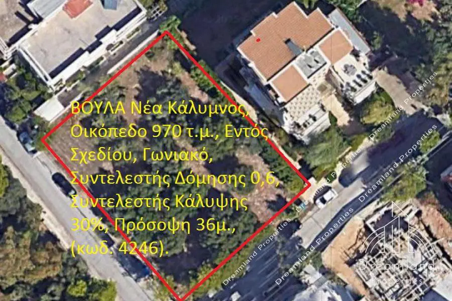 VOULA Nea Kalymnos, Land Plot 970 sq.m., Within Urban Plan, Crner Plot, Building Coefficient 0.6, Coverage Coefficient 0.3, Facade 36m, Price 1.600.000 Euros (Listing code: 4246). "Dreamland Properties" Office: +30 21210.46321 Mobile: +30 6951.341780 WhatsApp/Viber, Pls Leave a Message. Web: www.dreamlandproperties.gr Email: [email protected] Opening Hours: Mon-Fri: 09:30-17:30 (GMT+2)