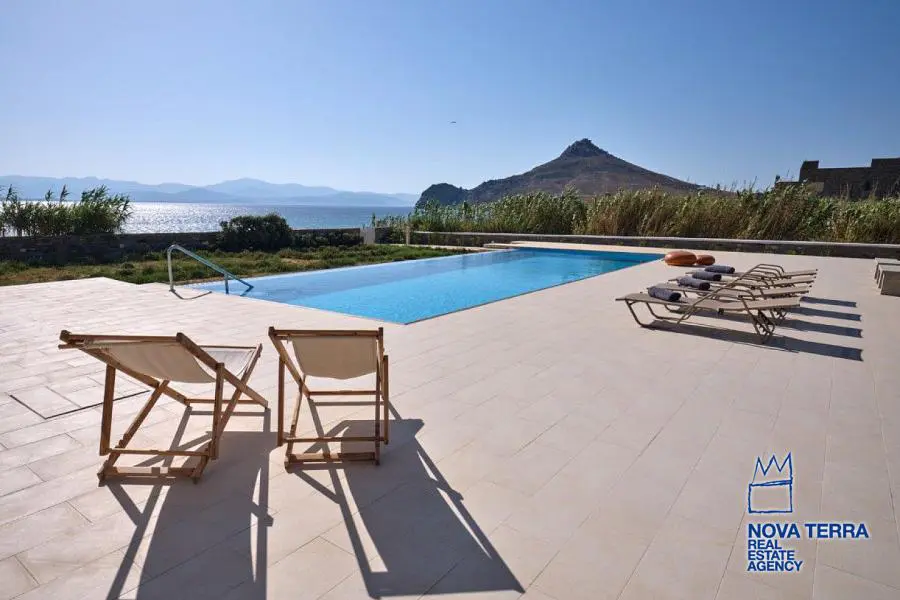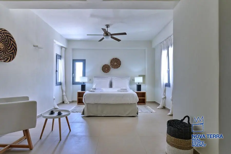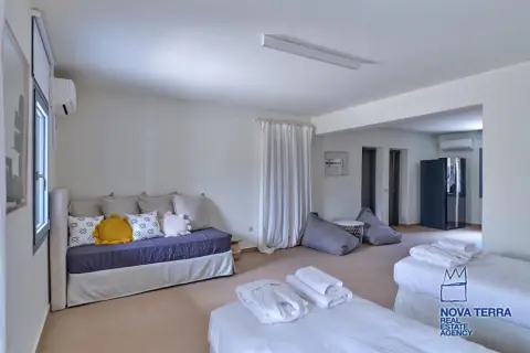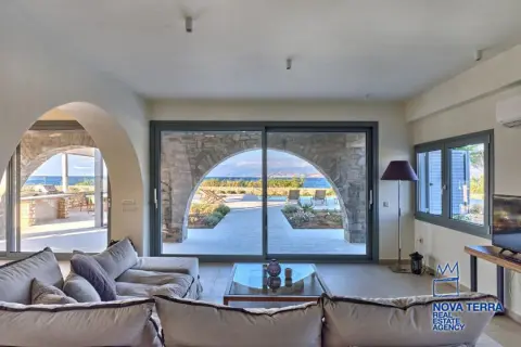 For sale in Paros, a luxurious villa with a total area of 520 sq.m on a spacious plot of 4000 sq.m. This stunning property was built in 2005 and features 7 rooms spread across the Ground Floor and 1st floor. Enjoy breathtaking sea views and unobstructed scenery from the balcony. The villa includes 5 bathrooms, a garden, kitchen, living room, store room, and toilet. The flooring is tiled and the heating is provided by air conditioning. Other features include access road, aluminium panels, bright interior, double-glazed windows, luxury finishes, painted walls, satellite TV, security door, and is located in a residential area near the seaside. The property is in perfect condition and allows pets. It also includes a satellite dish, parking area, and energy class B certification. Property ID: 52711. Visit www.nova-terra.gr for more information.