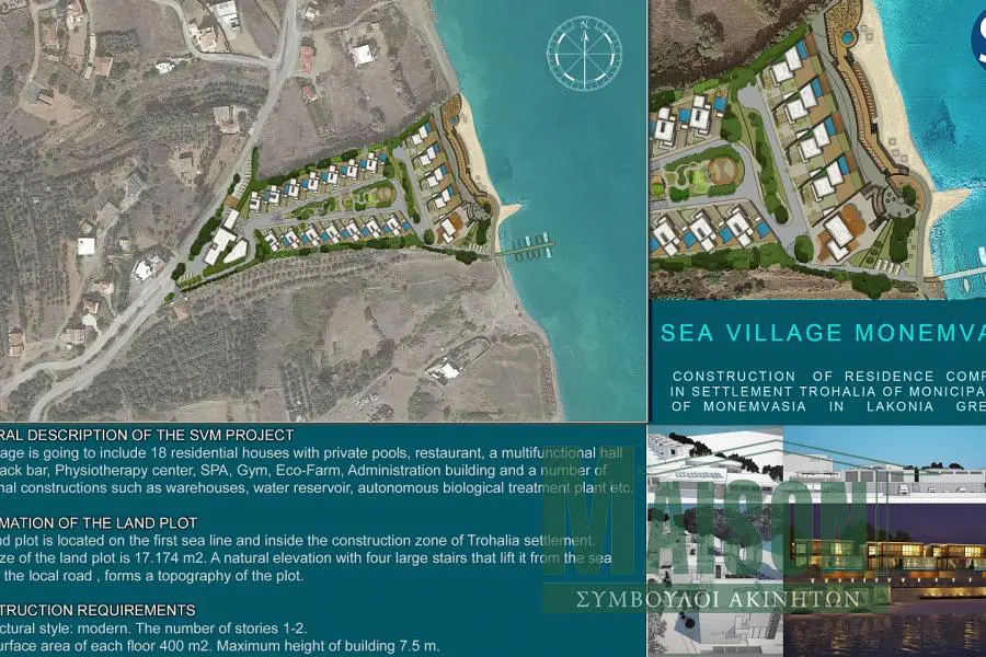 Μονεμβασιά, Παραθαλάσσια εκταση με δυνατότητα ΑΝΕΓΕΡΣΗΣ ΞΕΝΟΔΟΧΕΙΑΚΗΣ ΜΟΝΑΔΑΣ SEA VILLAGE LUXURY VILLAS BOUTIQUE HOTEL, 18 μοντερνες βίλες από ξύλο & γυαλί, ιδιωτικές πισίνες & μπροστά στη θάλασσα.Το συγκρότημα διαθέτει εστιατόριο , αίθουσα με snack bar, κέντρο φυσιοθεραπείας,SPA, γυμναστήριο , οικολογική φάρμα,κ.α. Η συνολική έκταση είναι 17,174τμ . Το συγκρότημα αποτελείται από οικίες μοντέρνας αρχιτεκτονικής, 14 εκ των οποίων είναι με 3 υ/δ ( μεζονέτες 183,6τμ συνολικής επιφάνειας,1 υ/δ master, ξύλινα πατώματα ,με μπαλκόνια,wc, 2 μπάνιο, καθιστικό , τραπεζαρία.κουζίνα, ιδιωτική πισίνα, κήπο,bbq, θέσεις στάθμευσης),και 4 με 4υ/δ ( μεζονέτες 215τμ συνολικής επιφάνειας, 1 master υ/δ με θεα θάλασσα, 7μτ ιδιωτική πισίνα ξύλινα πατώματα, , μπαλκόνια, wc, μπάνια,καθιστικό, τραπεζαρία , κυζίνα, κήπο , bbq, θέσεις στάθμευσης).Ενεργειακή κλάση A+, κωδικός ακινήτου: 18345, www.maison-estate.gr