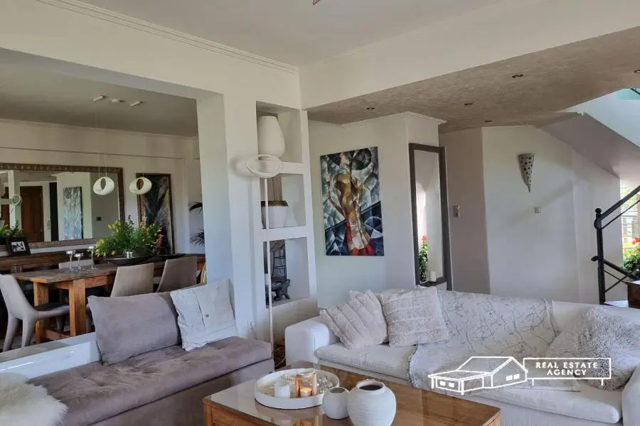 Αγία Μαρίνα, διατίθεται προς πώληση πολύ ωραία βίλα 300 τμ σε γωνιακό οικόπεδο 430 τμ, μόλις 2' με το αυτοκίνητο από τον παραλιακό δρόμο και την παραλία. Βρίσκεται σε ήσυχη γειτονιά με μονοκατοικίες και προσφέρει ιδιωτικότητα. . Αποτελείται από ένα πολύ άνετο σαλόνι με τζάκι, υπερυψωμένη τραπεζαρία και κουζίνα οπεν πλαν. Εξωτερικά υπάρχει κλειστή, πολύ φωτεινή σκεπαστή βεράντα που χρησιμεύει σαν καθιστικό με άμεση πρόσβαση στον κήπο και 2 μπαλκόνια όλα με θέα στον κήπο. Στον 1ο όροφο υπάρχουν 2 υπνοδωμάτια εκ των οποίων το ένα με ιδιωτικό μπάνιο και καθιστικό με θέα θάλασσα και βουνό, καθώς και ένα άλλο μπάνιο. Στο playroom υπάρχουν 2 υπνοδωμάτια, μπάνιο, laundry room, γυμναστήριο και αποθήκη. Η μονοκατοικία έχει πολύ όμορφο κήπο με δέντρα, λουλούδια, αυτόματο πότισμα και πέργκολα, αυτόνομη θέρμανση για κάθε όροφο, a/c, διπλά τζάμια με σίτες, πόρτα ασφαλείας, συναγερμό, ηλιακό θερμοσίφωνα και υπαίθριο parking. Βρείτε μας στο Facebook: Merryland Real Estate και στο Instagram: merryland_realestate.