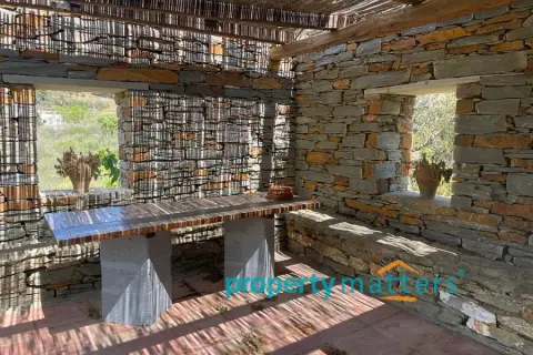 The 4,000 sq.m. property consists of two separate houses located 50 meters apart, surrounded by a mature garden. The plot is on level ground and just 170 meters from the sea. The first house is two stories and has a total area of 128 sq.m. The ground floor includes an open-plan living room and kitchen, a bathroom with a bathtub, one bedroom, and an internal storage room. The second floor features three bedrooms and a bathroom with a bathtub. All four bedrooms have built-in wardrobes. The house includes both internal and external staircases. The first floor has a terrace, while the ground floor is surrounded by covered and protected verandas. The second house is a single-story residence of 75.5 sq.m., consisting of an open-plan living room and kitchen, three bedrooms (two with built-in wardrobes), and a bathroom with a bathtub. This home also offers a large, shaded veranda ideal for outdoor dining. The property can be used as a family residence or divided into two or even three separate living units. Given the shortage of rental properties on the island, it could also serve as a reliable source of income. The layout of the two buildings and the mature garden filled with trees and shrubs ensure peace and privacy between them. Each house has its own electricity meter, heating system, and dedicated parking space. The two-story house also has the potential to be split into two smaller apartments — in fact, it is currently temporarily divided, with a separate apartment on the first floor. There are five external storage rooms on the property — three attached to the main house and two to the single-story house. There is ample space for a vegetable garden or further garden expansion. The mature trees and bushes offer shade and coolness during summer, year-round privacy, and a wonderful natural playground for children. The plot is just a ten-minute drive from the port of Korissia and five minutes by car from the popular, family-friendly beaches of Gialiskari and Otzias. It is only 170 meters from the sea and a five-minute walk from Vourkari — the charming seaside village with a marina, shops, cafés, tavernas, bars, and an ice cream parlor. It is also an ideal starting point for scenic walks or bike rides to the lighthouse, or for swimming and fishing around the nearby rocks and small beaches of Agia Irini and Kokka.