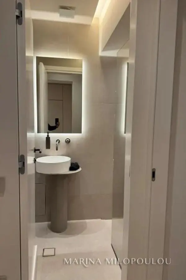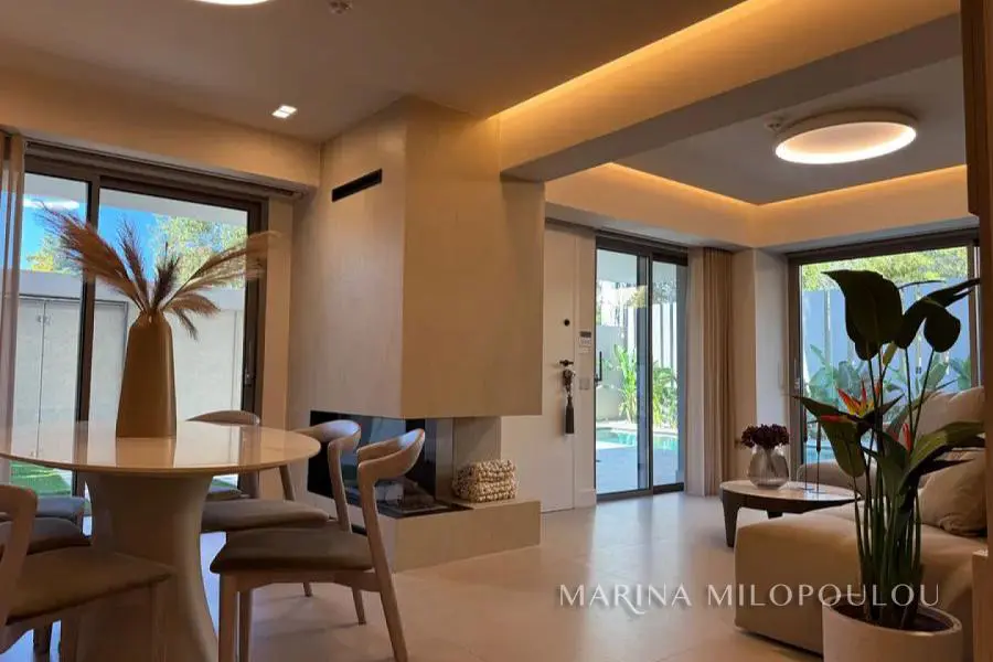 ΒΟΥΛΑ-Κάτω, Νεόδμητο, Επιπλωμένο οροφοδιαμέρισμα ισογείου, 97τμ, με ιδιωτικό κήπο και πισίνα. Αποτελείται από ενιαίο χώρο υποδοχής-τραπεζαρία με τζάκι υγραερίου, κουζίνα πλήρως εξοπλισμένη, 2 master υ/δ (το ένα με walk-in closet) και 1 επιπλέον μπάνιο. Αποτελεί μέρος σύγχρονου, γωνιακού, 3όροφου κτιρίου 4ων οροφοδιαμερισμάτων, ενεργειακής κλάσης Α+ Διαθέτει θερμαινόμενη πισίνα με αντίθετο ρεύμα και υδρομασάζ, ανεξάρτητη ιδιωτική είσοδο, Ιδιωτική θέση στάθμευσης (ανοικτή), ενδοδαπέδια θέρμανση και κεντρικό κλιματισμό με αντλία θερμότητας, ηλιακό θερμοσίφωνα, φωτοβολταϊκό σύστημα για σημαντική μείωση της κατανάλωσης ρεύματος, συναγερμό, κοινόχρηστο γυμναστήριο με hammam και sauna. Το διαμέρισμα θα κατοικηθεί πρώτη φορά. Κοινόχρηστα 150€/μήνα στα οποία περιλαμβάνονται η χρήση τoυ γυμναστηρίου και το Internet. Εξαιρετική θέση ακινήτου κοντά στα σύνορα με Γλυφάδα, απέναντι από πάρκο, σε απόσταση 400 μέτρων από τοπική αγορά, 1,2 χλμ από την Α πλαζ Βούλας, 1,5 χλμ από το κέντρο της Βούλας και από τον εμπορικό ιστό της Γλυφάδας.